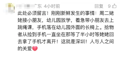 网友小飞象:“此处必须留言!周二姥姥接小朋友,幼儿园放学,手机落在幼儿园外面的长椅上。拾物者从捡到手机一直坐在那等了半小时等姥姥回去拿了手机才离开!这就是深圳!人与人之间的关爱。”