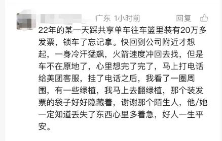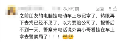 网友好运降林:“之前朋友的电脑挂电动车上忘记拿了,转眼再下去找已经不见了,以为要赔公司了,报警后不到一天,警察来电话说外卖小哥看挂在车上拿去警察局了。”