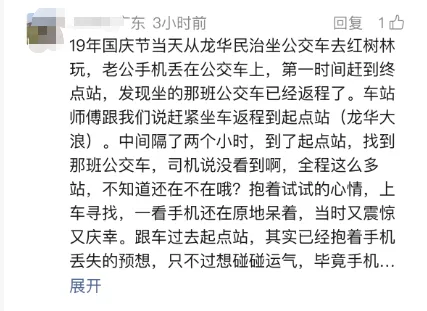 网友JUAN:“2019年国庆节当天从龙华民治坐公交车去红树林玩,老公手机丢在公交车上,第一时间赶到终点站,发现坐的那班公交车已经返程了。车站师傅跟我们说赶紧坐车返程到起点站(龙华大浪)。中间隔了两个小时,到了起点站,找到那班公交车,司机说没看到啊,全程这么多站,不知道还在不在哦?抱着试试的心情,上车寻找,一看手机还在原地呆着,当时又震惊又庆幸。”