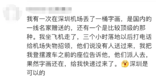 Seaman出海渔夫:“我有一次在深圳机场丢了一桶字画,是国内的一线名家赠送的,还有一个是比较顶级的那种。我坐飞机走了,三个小时落地以后打电话给机场失物招领,他们说没有人送过来,我把我登摆渡车之前的座位告诉他,他们派人去,果然字画还在,给我快递过来了。深圳是可以的。”