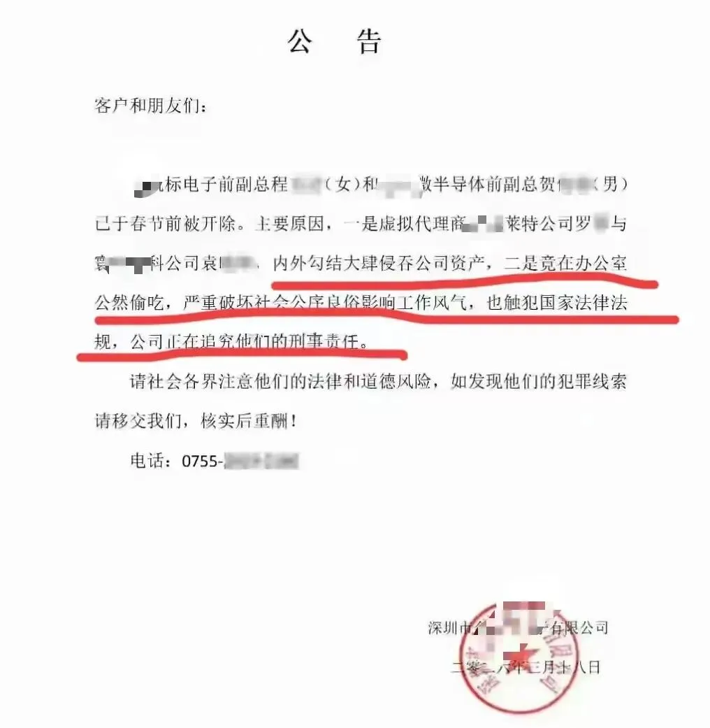 他将公告拍成照片,发在了公司全员群里。一时间,群里炸开了锅。震惊、愤怒、难以置信的情绪在屏幕间飞速流转。很快,这份公告被好事者转发到了各大行业论坛和社交平台上,标题一个比一个劲爆:“深圳某科技公司惊天丑闻”、“高管办公室偷吃被抓现行”、“侵吞资产数百万,老板忍无可忍发公告”。