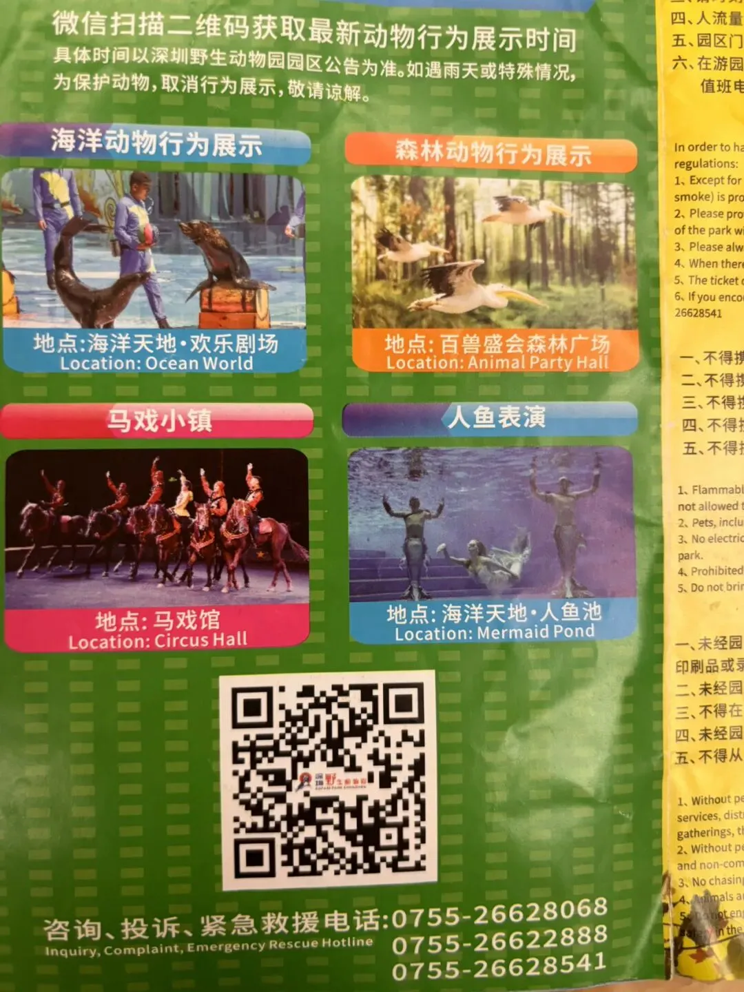 以前觉得坐公交到动物园好远,现在交通比想象中便捷得多。我们选择了地铁出行,搭乘深圳地铁7号线直达终点站「西丽湖站」,从B出口出来右转再右转步行约10分钟,推婴儿车的可以走D出口无障碍电梯,门票需提前一天预约或者在当天早上9点前预订好哦,成人票仅需199元,季票238.比现场购买优惠不少。入园处可以领取纸质导览图,当然,关注官方公众号获取电子地图和当日表演时间表也是明智之选。