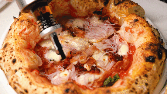两台意大利原装进口的火山石窑炉镇场,每个披萨在高达500°C的高温之下,只需进炉90秒即可烘熟。饼底薄如蝉翼,边缘蓬松有韧劲。 大焦泡