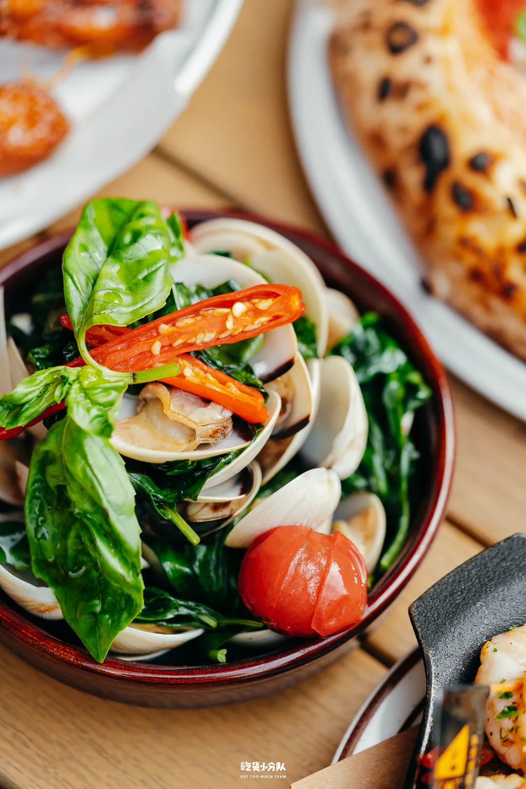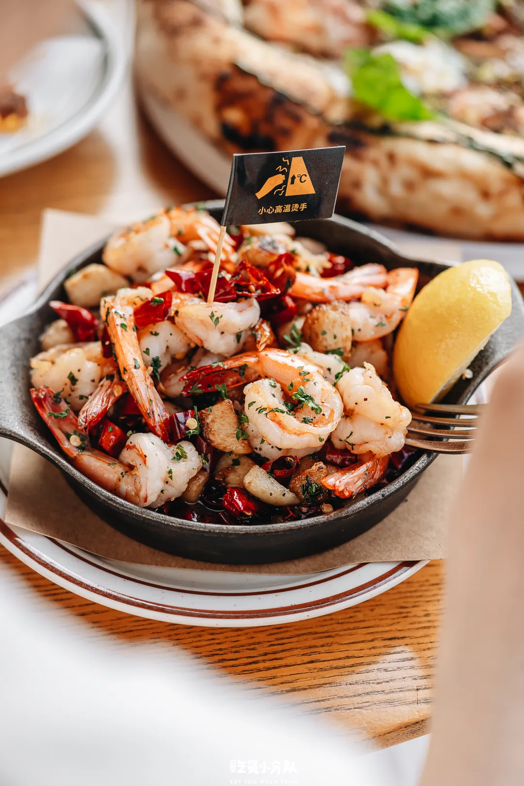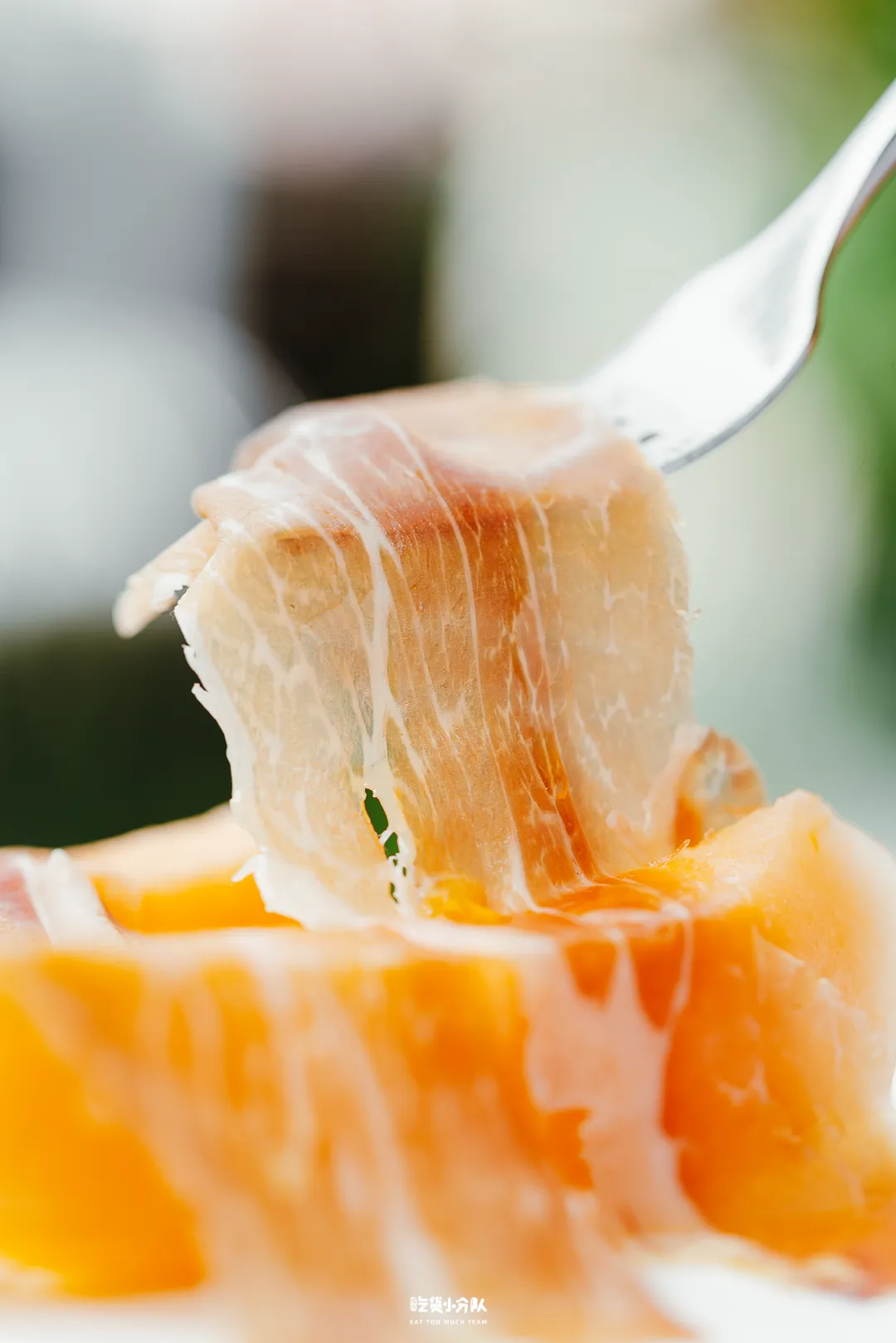 蒜粒被铁锅烫到焦香扑鼻,香气渗入新鲜海虾肉里,微辣不呛口,非常下酒。而且虾肉还细心地剔除了虾线,吃着饱满Q弹。蜜瓜火腿