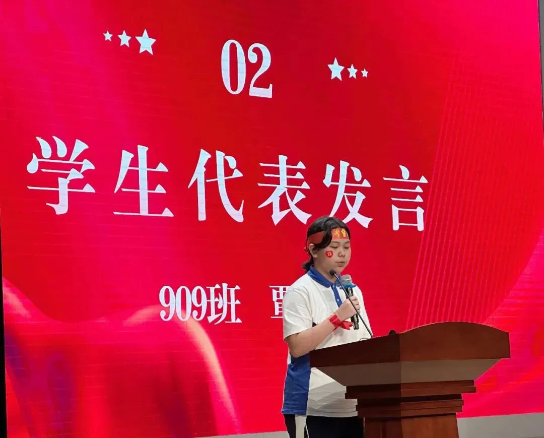 少年自有凌云志,不负韶华行且知。909 班覃梓涵同学作为学生代表登台发言,她号召同学们珍惜最后的备考时光,以脚踏实地的努力对抗前路的一切挑战,以永不言弃的执着追逐心中的梦想。