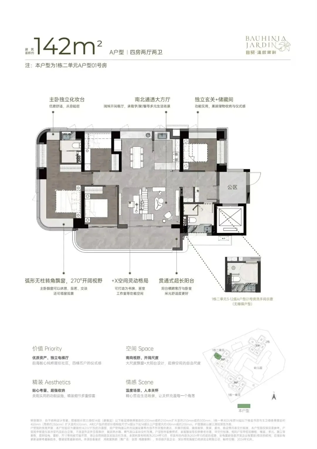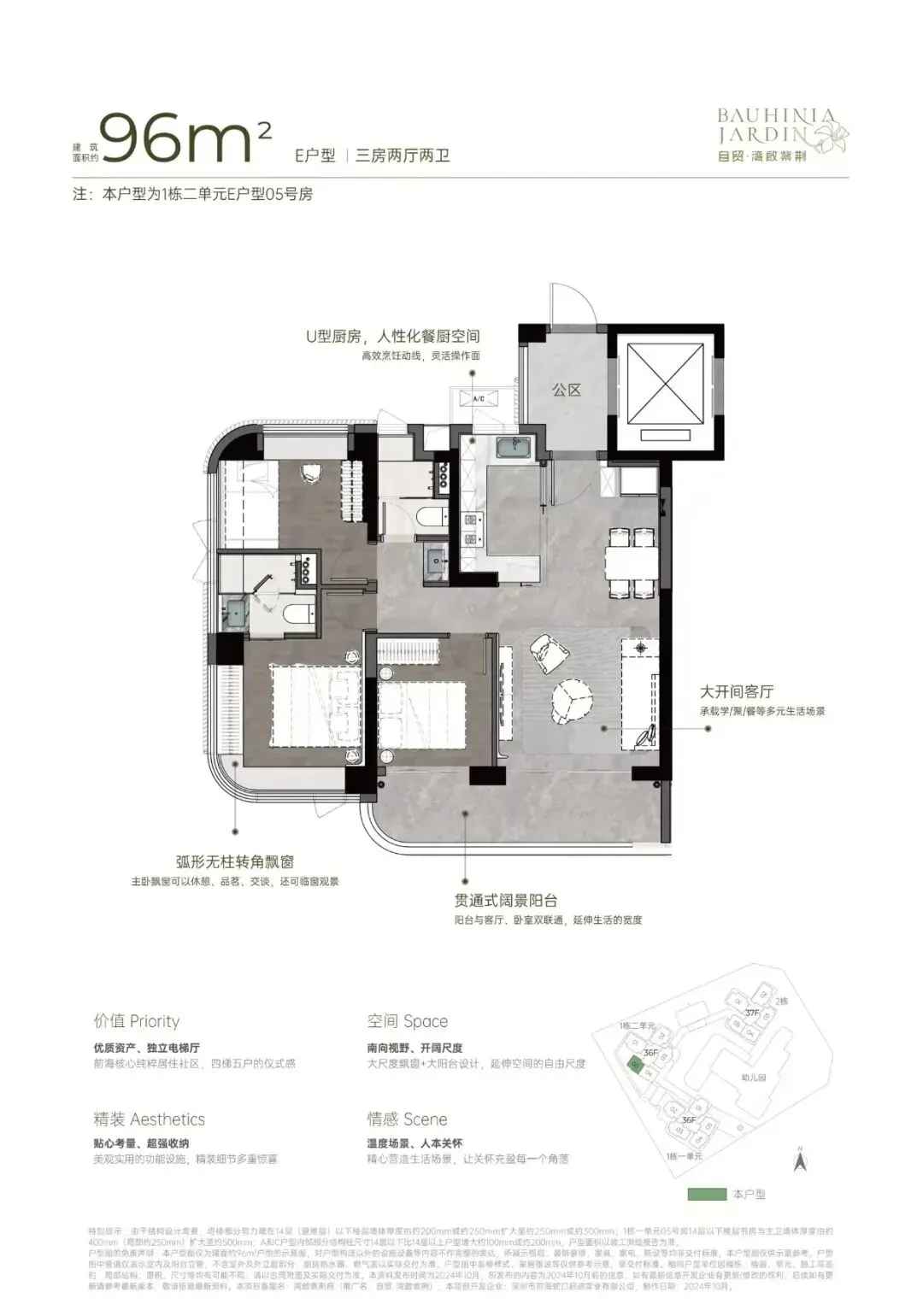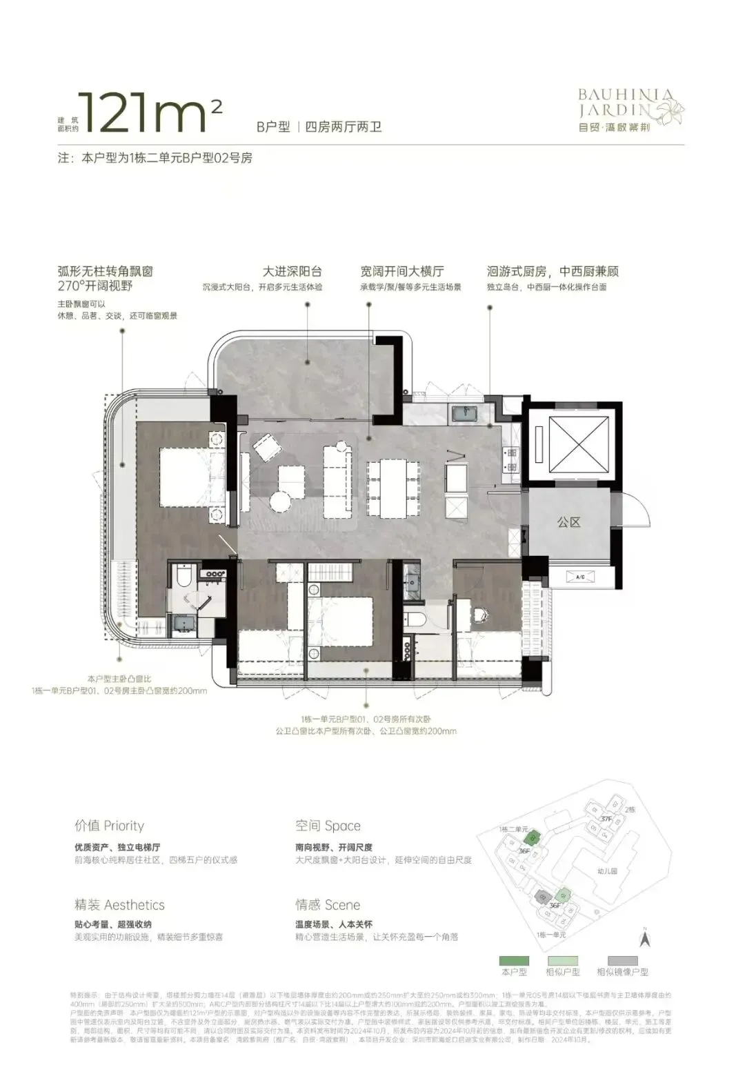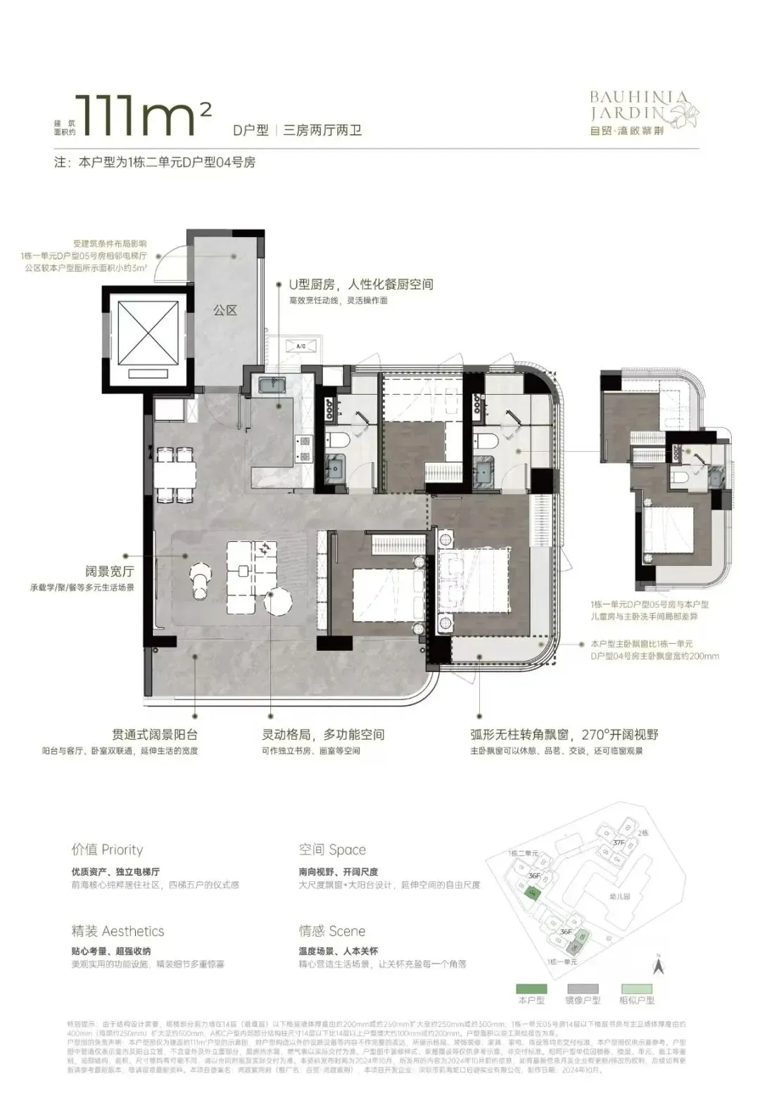 自贸·湾啟紫荆府(原妈湾15单元02街坊15-02-02地块),位于前海妈湾听海大道,妈湾地铁站400米范围内。项目占地约1.5万㎡,住宅建面约6.6万㎡,规划3栋36-37层高住宅,总户数共485户,3梯4户,车位595个,车位比1:1.2以上,容积率4.47。户型采用建筑新规设计,户型分别96-111-121-122-142平三房至四房,四梯五户,户型设计了独立电梯厅、大客厅、宽景阳台、阔景飘窗等,拥有山海河多重景观资源,计划品质精装交付。从空间布局来看,U 型厨房的设计极为人性化,大开间客厅与宽阳台是整个户型的最大亮点,西南向视野使得整个户型采光充足,贯通式阔景阳台与客厅、卧室双通,极大地拓展了生活空间的宽度。主卧的飘窗台也是一大亮点,弧形无柱转角飘窗不仅提供了广阔的视野,还增加了室内的采光。户型实际为3+1户型,客厅可作为一个大开间的宽厅,也可以隔出一个灵动空间作为书房、工作间。主卧空间南北通透,飘窗也得到了进一步的有效利用。同样是贯通式阳台联通客厅、卧室,阳台的宽度要比96㎡户型大许多,空间尺度提升明显,且有东南、西南两种朝向。横厅四房,东南朝向,空间感开阔,采光通风佳,没有大面积的走廊或过道,节省了空间,动线也更加流畅。主卧拥有更加开阔的景观面,大面积的弧形无柱飘窗,将外部的自然光线引入室内,空间更加明亮宽敞。双龙抱珠户型,书房分布于客厅另一侧,且难得是双面采光+270°景观视野。主卧南北通透,且拥有十分开阔的景观面。贯通式阳台联通客厅以及靠近动区的次卧,实现长观景阳台双龙抱珠户型,其中一间次卧位于客厅另一侧,双面采光,靠近动区,适合作为老人房或书房。客餐厅南北通透,兼顾横厅与竖厅优点,空间感足,利用率高,动静分离、干湿分离设计合理。贯通式超长宽境阳台,采光舒适度高。