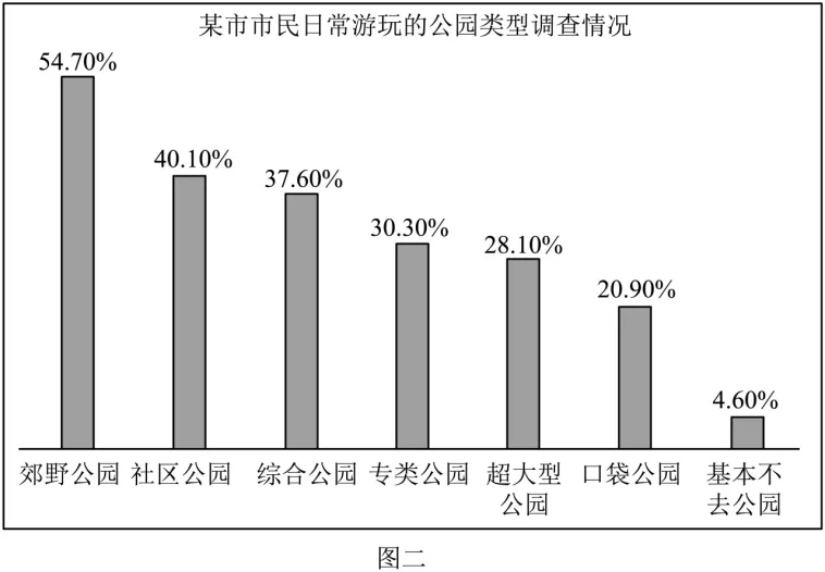 (2)从材料三图二“某市市民日常游玩的公园类型调查情况”看,郊野公园的占比为54.70%,在各类公园类型里数值最高;社区公园占40.10%,综合公园占37.60%,二者占比紧随郊野公园之后。后续“专类公园”“超大型公园”等占比依次降低,“基本不去公园”仅4.60%。通过各类型公园占比的对比,能明确郊野公园是该市市民日常游玩公园类型的首选,社区公园和综合公园的受欢迎程度也较高,成为市民日常逛公园的重要选择。