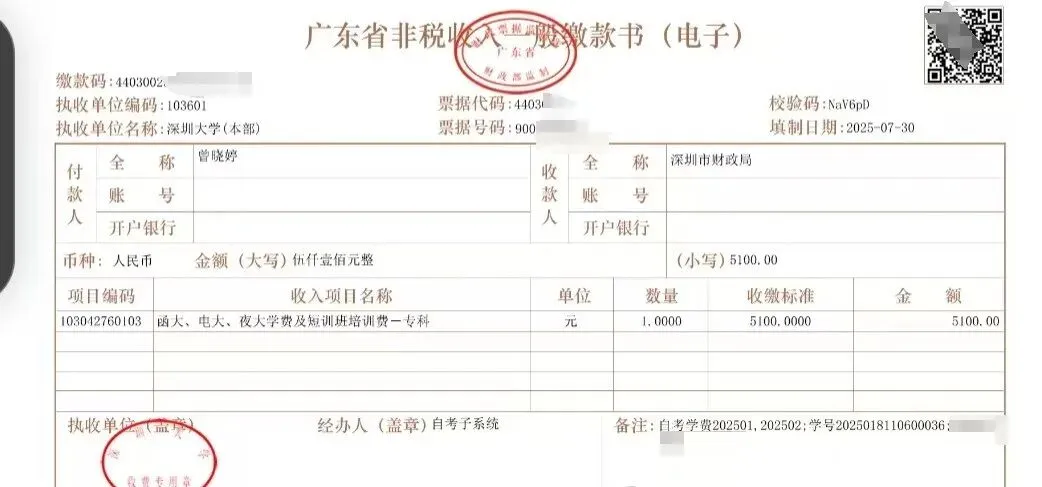 学费直接交大学,由深圳大学进行开票。