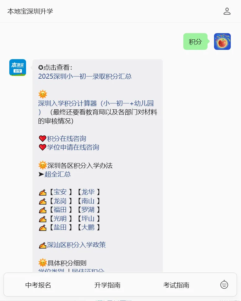 进入【本地宝深圳升学】回复【积分】