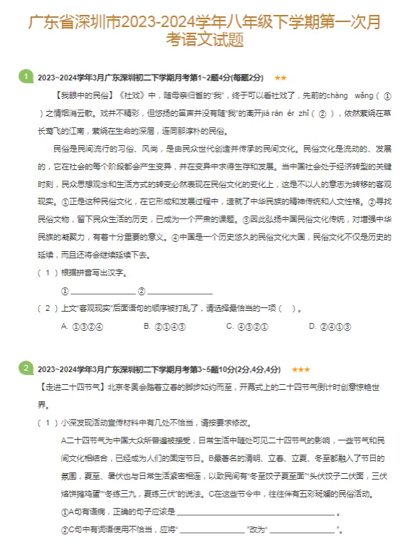 30套2016-2024学年深圳各区初二下学期月考语文真题及答案解析