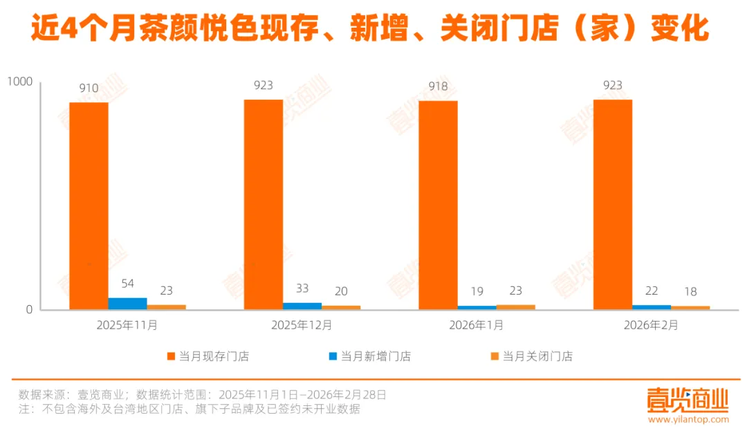 据壹览商业统计,近4个月茶颜悦色整体门店规模保持稳定,开关店数量趋于平衡。从现存门店看,茶颜悦色2025年11月门店数量为910家,12月门店数量来到923家;2026年1月门店回落至918家,部分门店可能受春节放假影响暂停营业;2025年2月门店数量又回归至923家,前期暂停营业门店陆续重新营业。