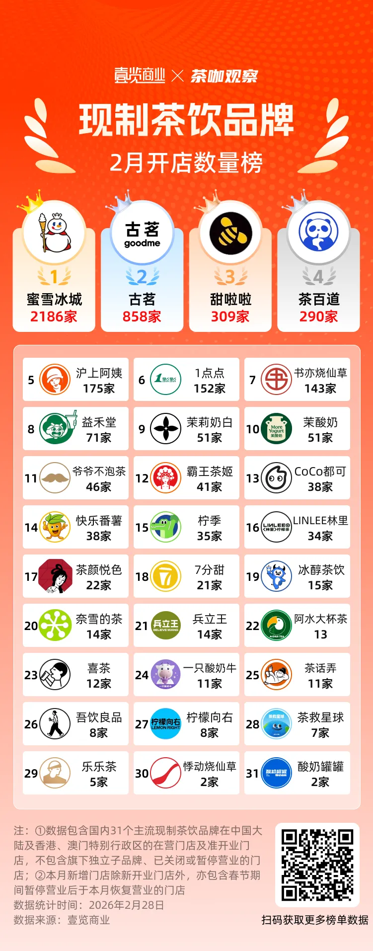 与同行对比,茶颜悦色的扩张节奏更显克制。据壹览商业统计,2026年2月,31个主流现制茶饮品牌中,茶颜悦色2月新增的门店数量排在第17,2月新增门店数量超过100家的有7个品牌,新增门店超过30家的有16个品牌。