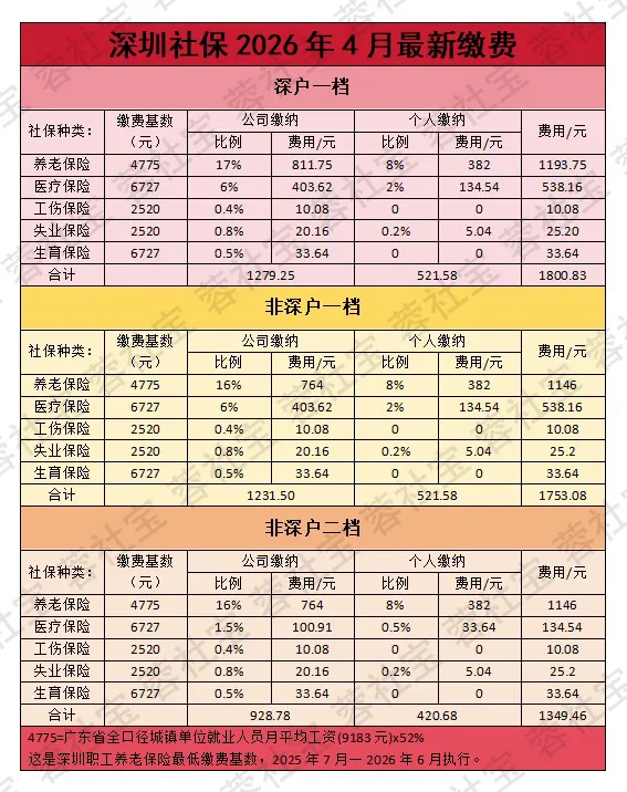 本次缴费标准执行的养老保险最低缴费基数 4775 元,执行周期为 2025 年 7 月 - 2026 年 6 月,缴费明细如下👇:社保缴费金额核心就看三点:缴费基数、缴费比例、参保档次。社平工资调整,养老、医疗、失业这些费用也会跟着变,大家记得多留意自己的社保扣费情况哦缴费基数与户籍差异:2026年4月深圳社保缴费基数4775,深户比非深户多交1%地方补助,体现在职工五险/灵活就业养老缴费中,该补助直接影响退休金,交的越久、基数越高,退休金差距越大