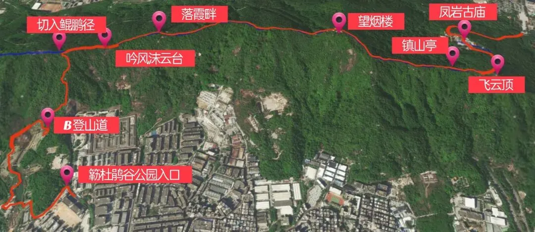 这次的目标,是一条融合了绚烂花海、山脊奇石与古庙祈福的徒步路线:簕杜鹃谷公园→B登山道→凤凰山望烟楼→飞云顶→凤岩古庙→凤凰山森林公园西门