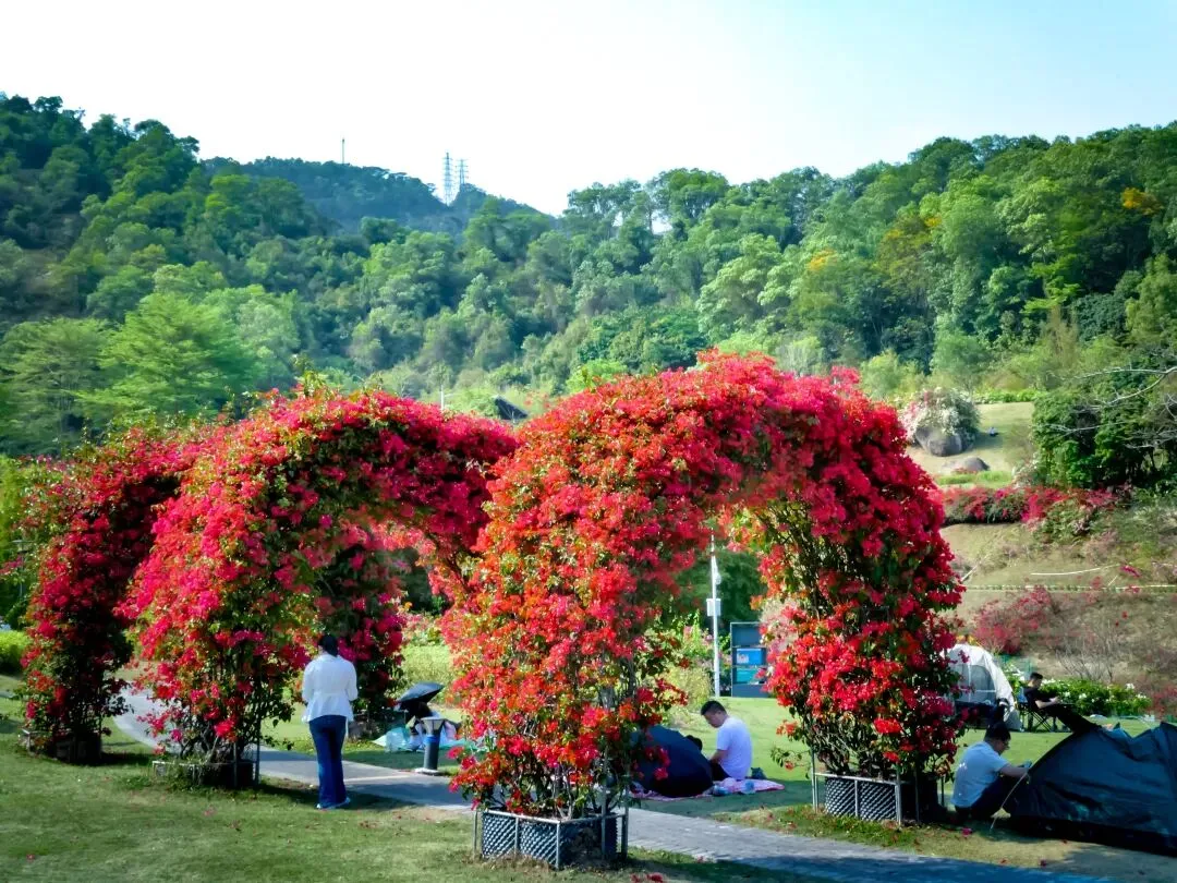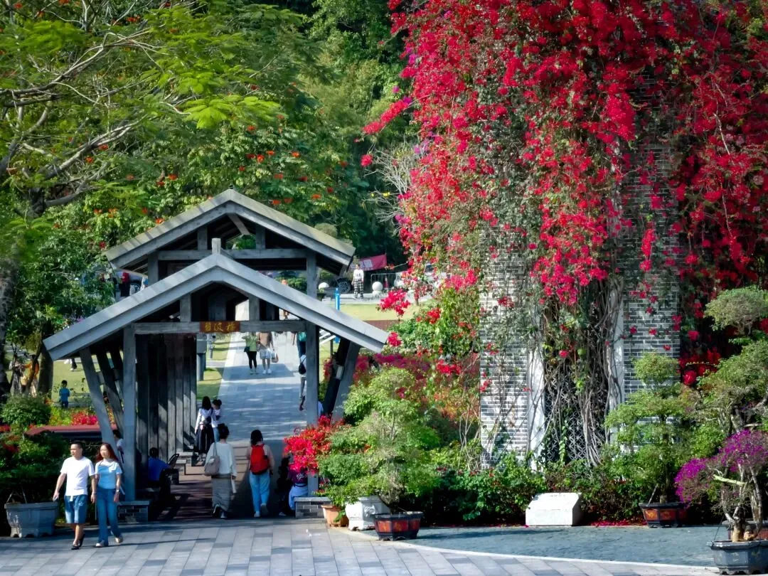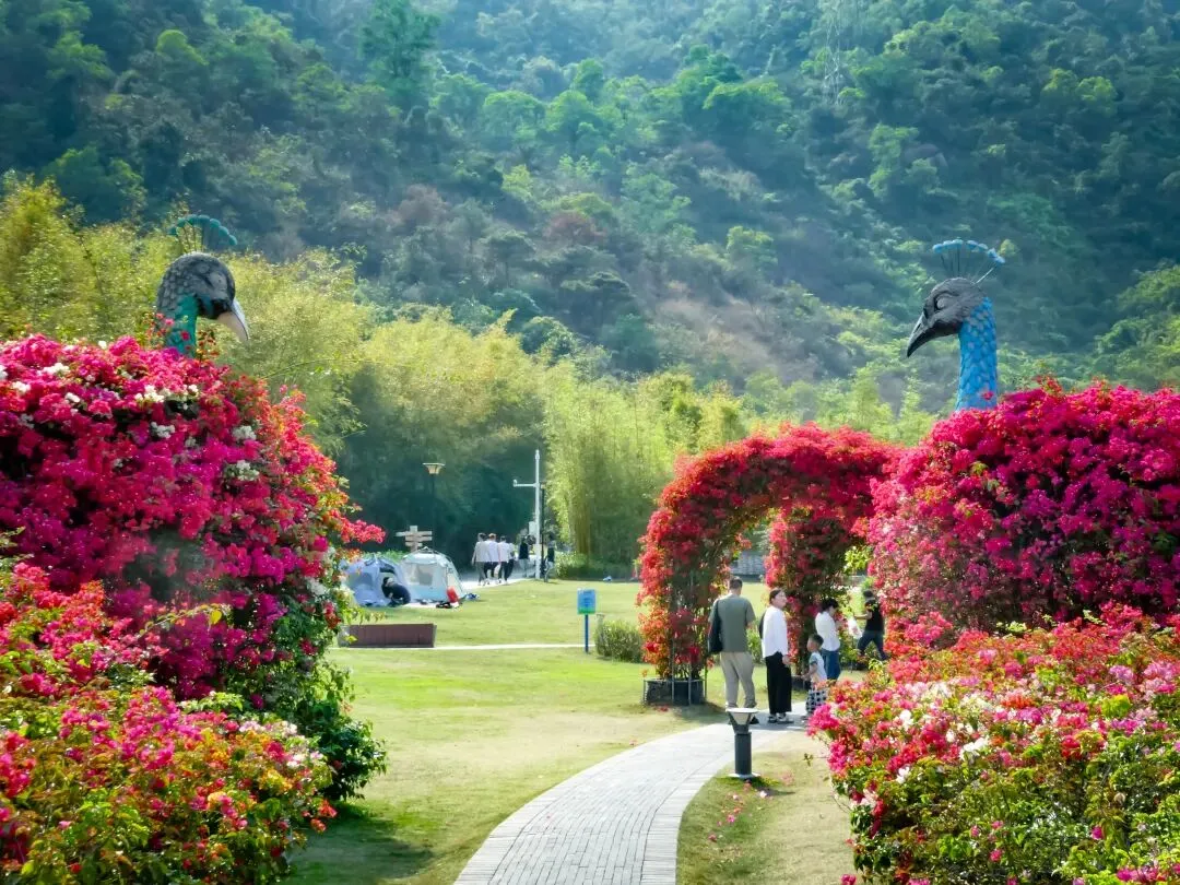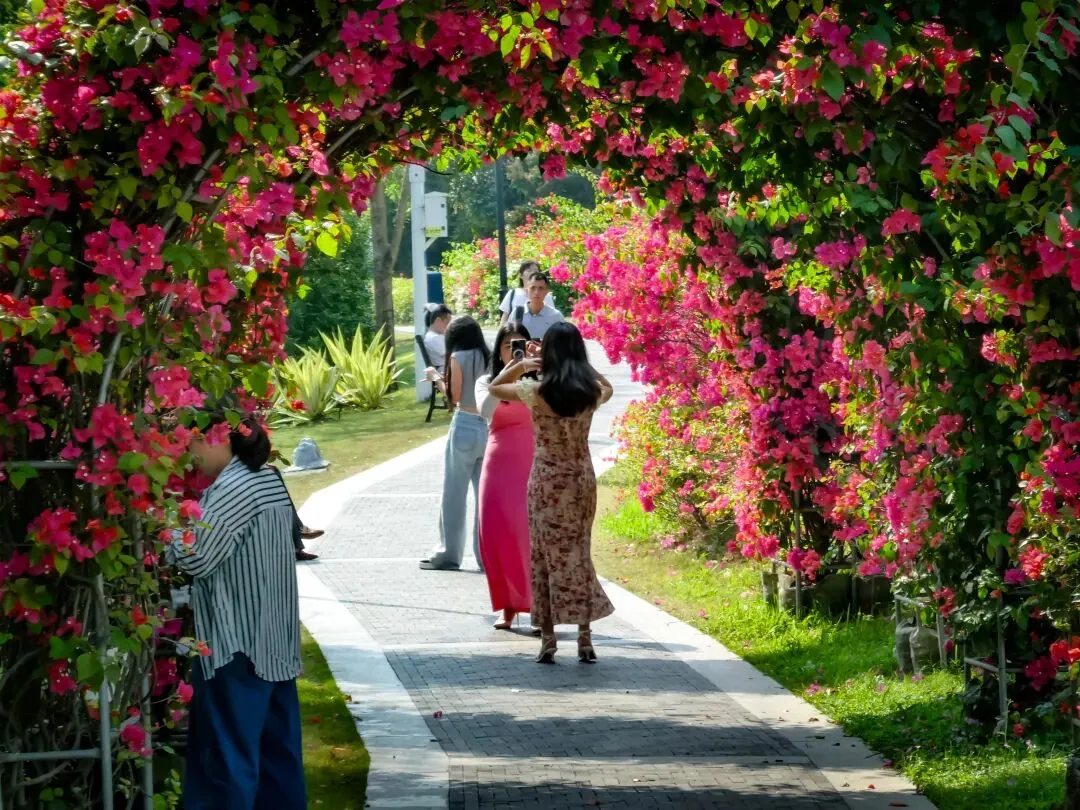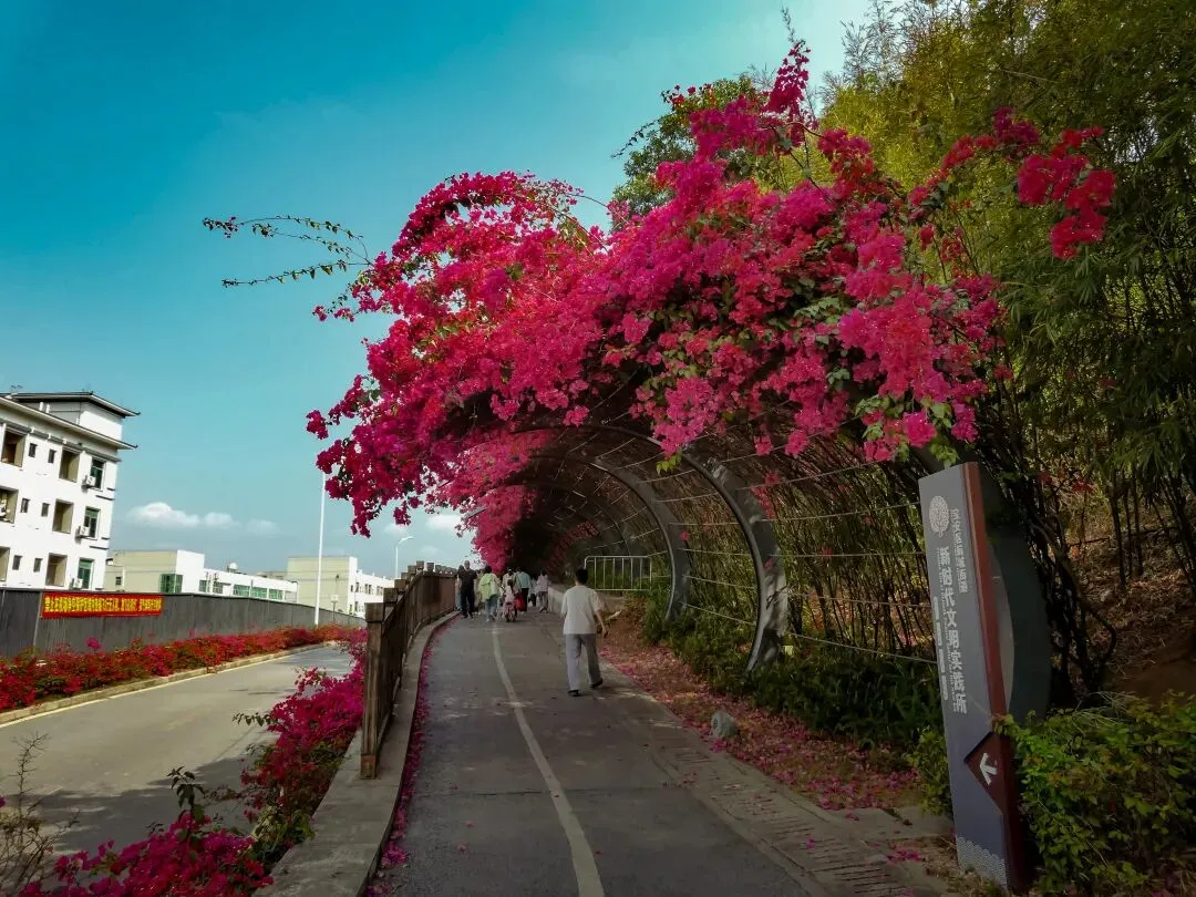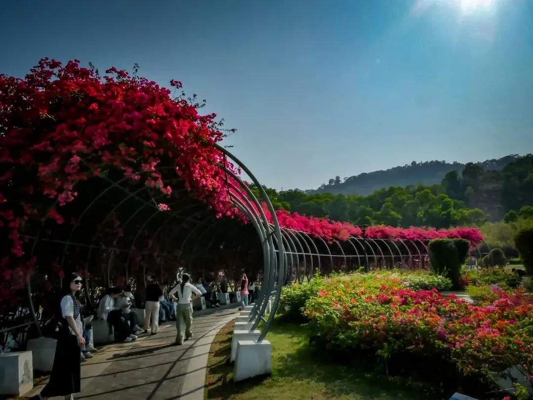 导航定位“簕杜鹃谷公园”,抵达便是惊艳。公园入口,一条长达300米的三角梅拱形长廊热烈地迎接每一位访客,行走其间,仿佛穿越一条通往春天的花隧道。