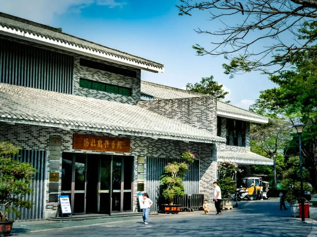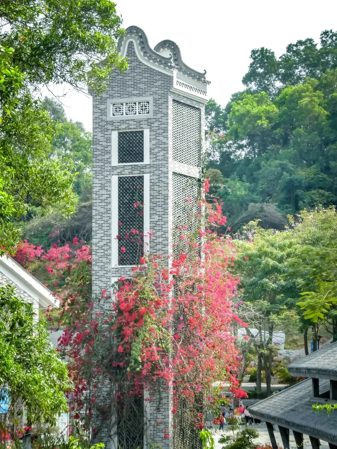 往里走,碧波桥旁,一座20多米高的塔楼爬满红艳的三角梅,成为最亮眼的背景板。旁边的植物科普文献馆青砖黛瓦,静立一旁,诉说着花的学问。