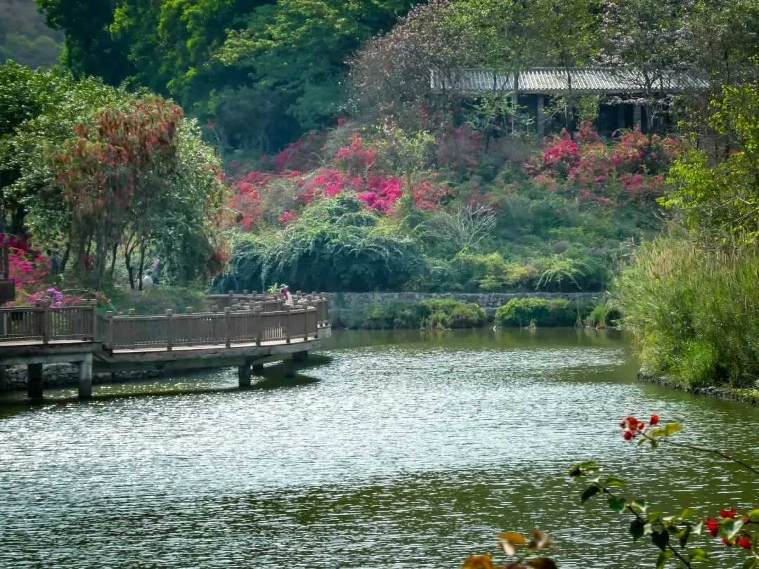 沿湖而行,百米水上栈道蜿蜒湖面。凭栏望去,湖水微漾,四周花团锦簇,远山如黛,构成一幅完美的春日画卷。