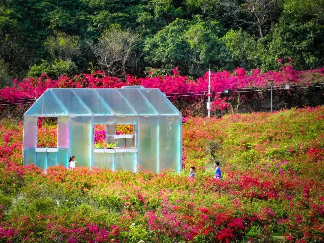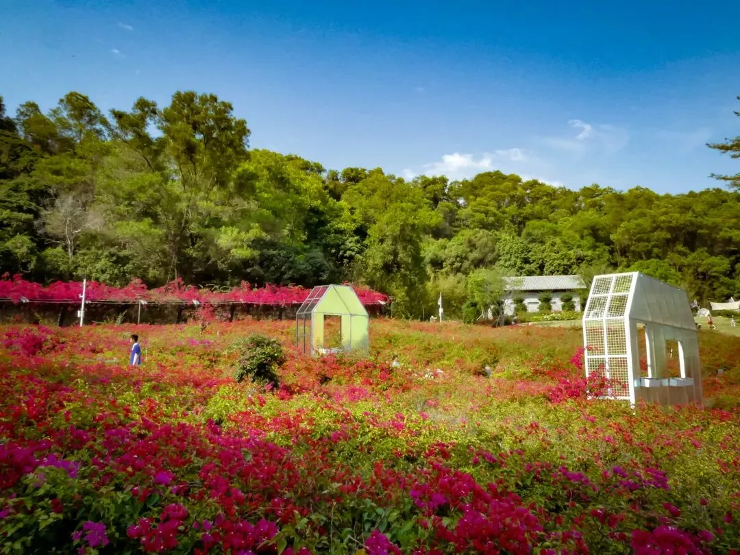 再行百米,公园最深处又是一片玫红色三角梅花海,花海中央的镜面玻璃小屋如同童话里的秘境,随手一拍都是大片。