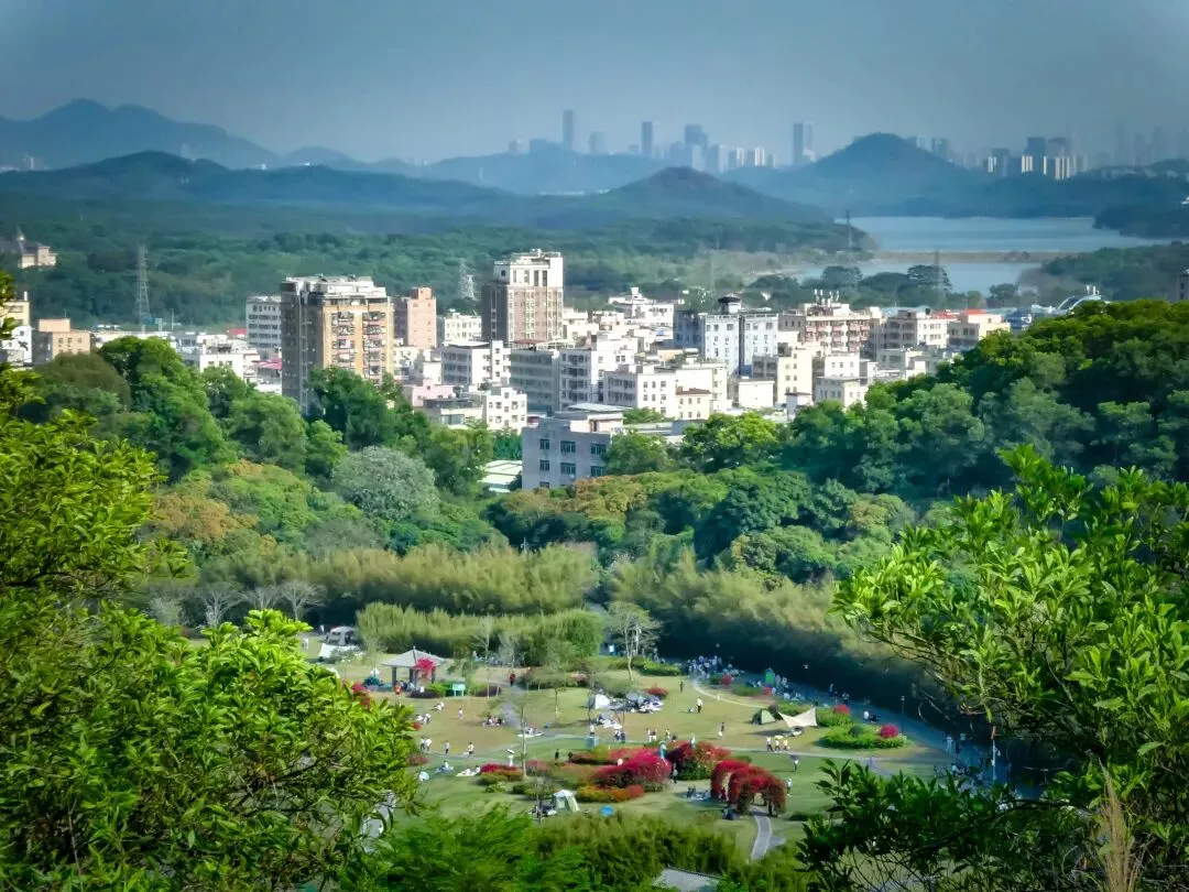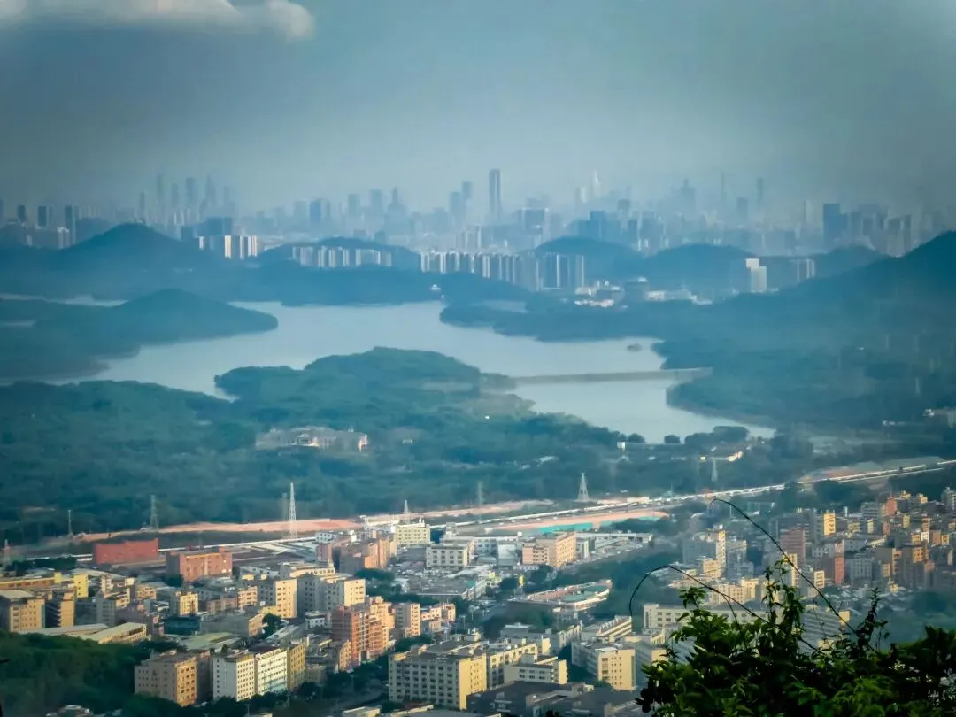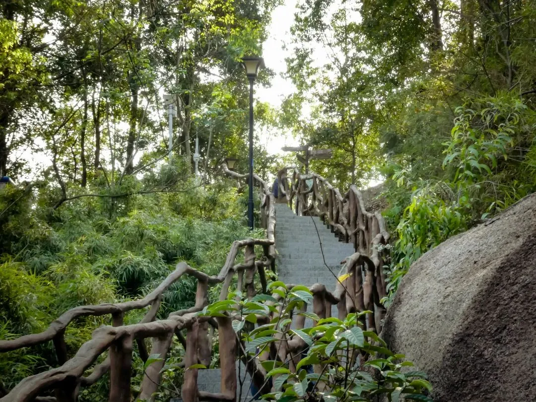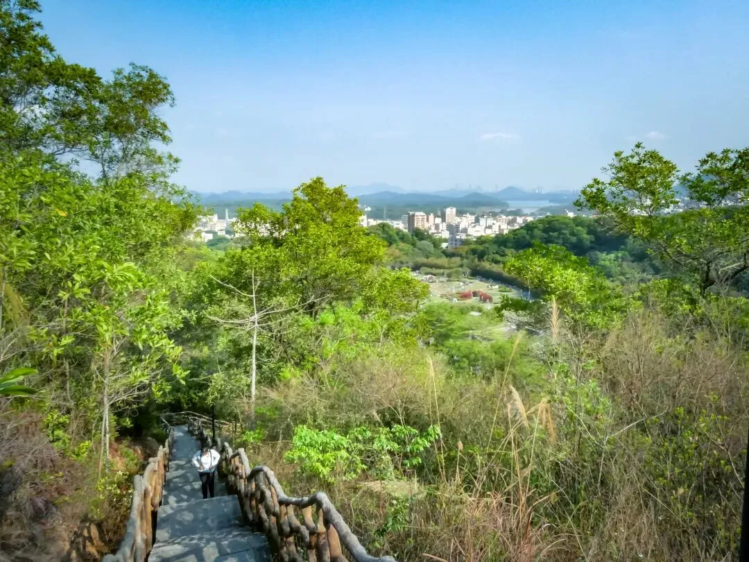 从B登山道起步,台阶步行约60米左右后,回头望去,视野已经可俯瞰簕杜鹃谷公园一角,远眺宝安九围片区和铁岗水库,城市与山水尽收眼底。