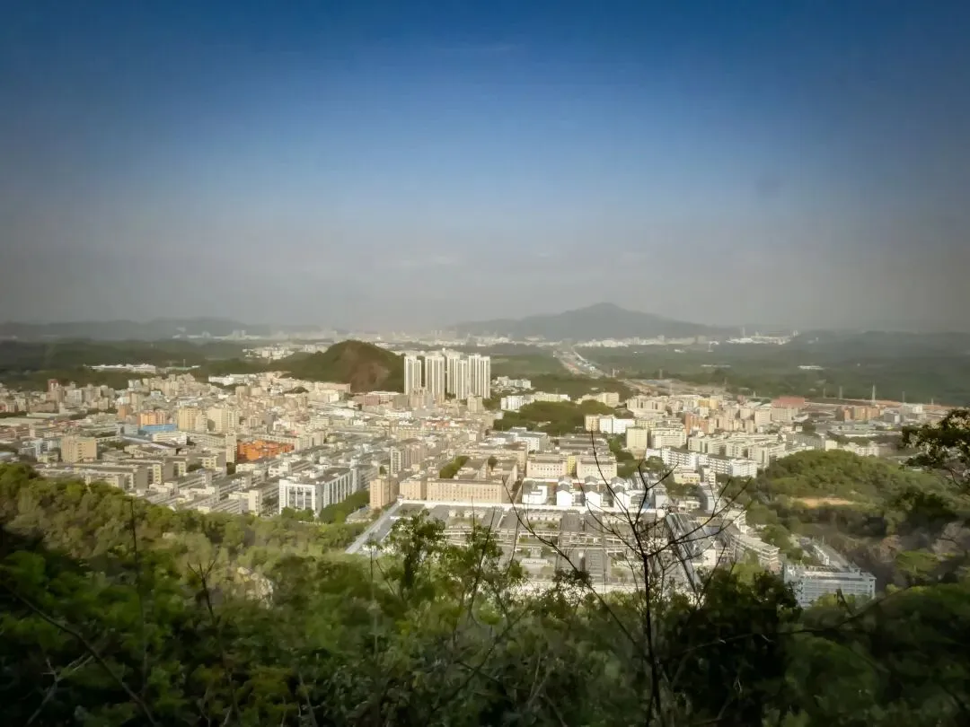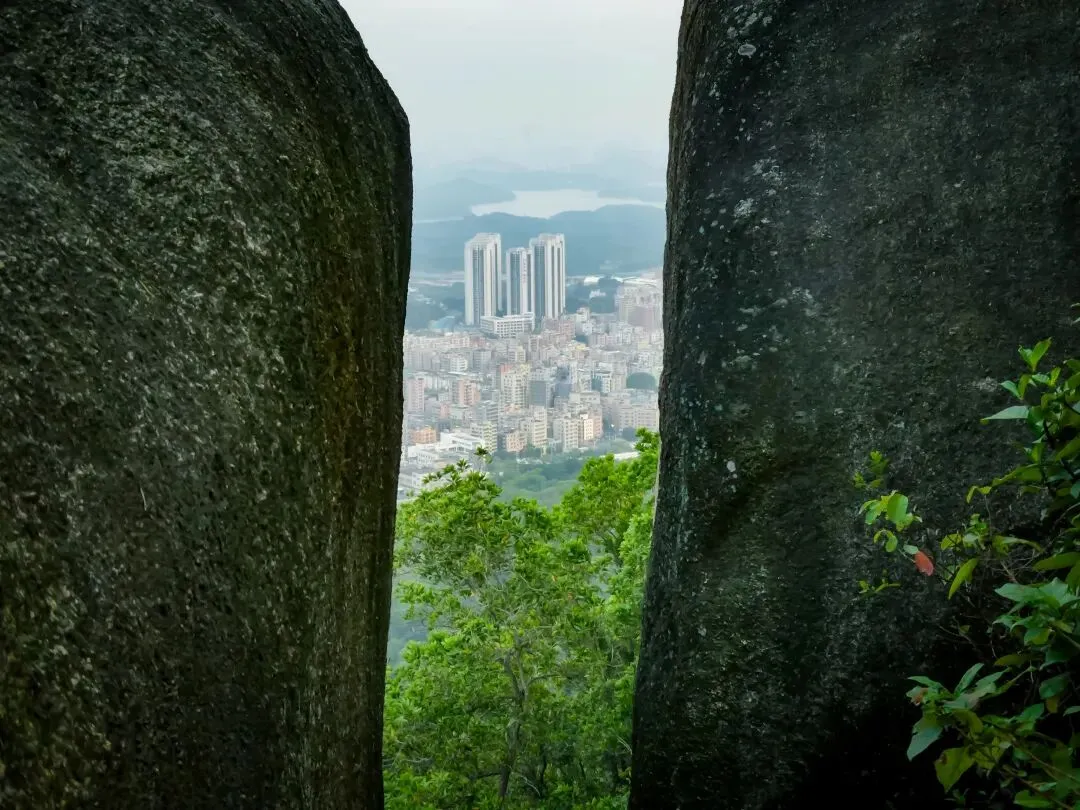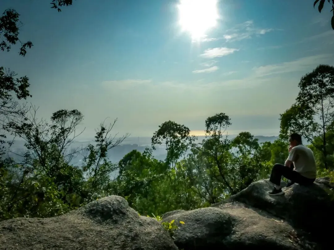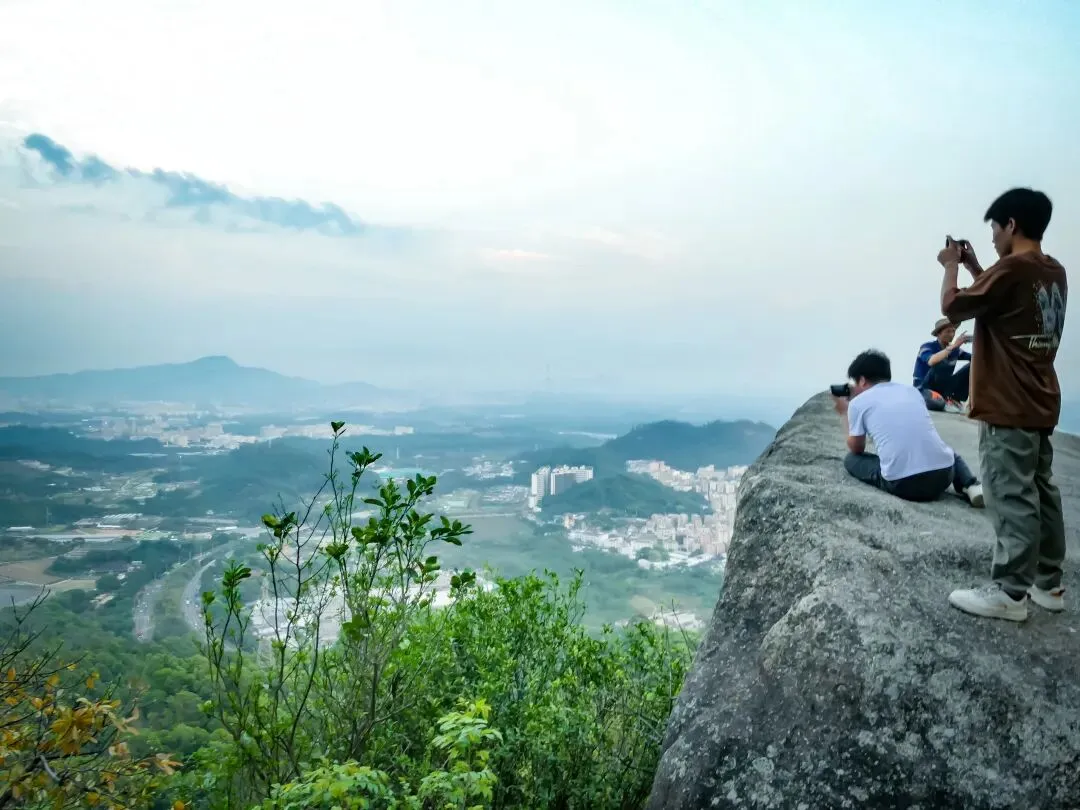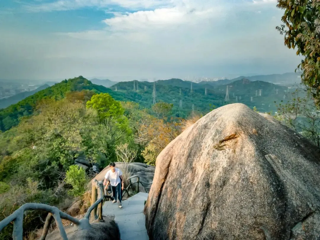 稍作停留,继续向北前往飞云顶。山路岔口虽多,但指示清晰,按路牌行走即可。途中,一处突出的巨石成为绝佳观景台。站在巨石上,眼前景象层次分明:近处,青山翠浪,层叠起伏;中景,凤岩古庙的建筑群点缀在半山腰;远景,福永、沙井的城市轮廓在薄雾中铺开,构成一幅“自然与城市的对话”画卷。