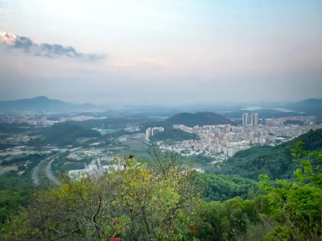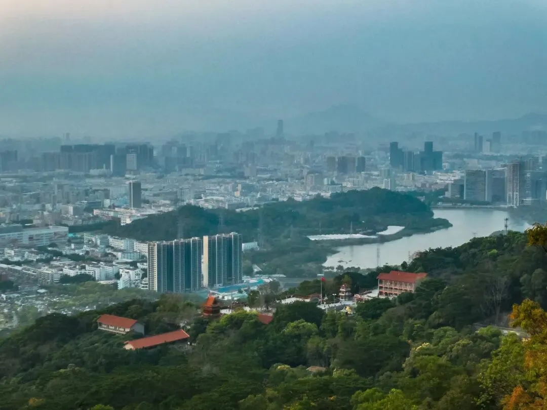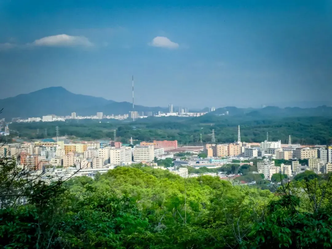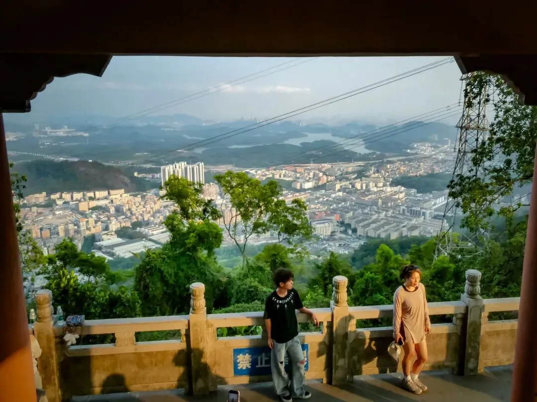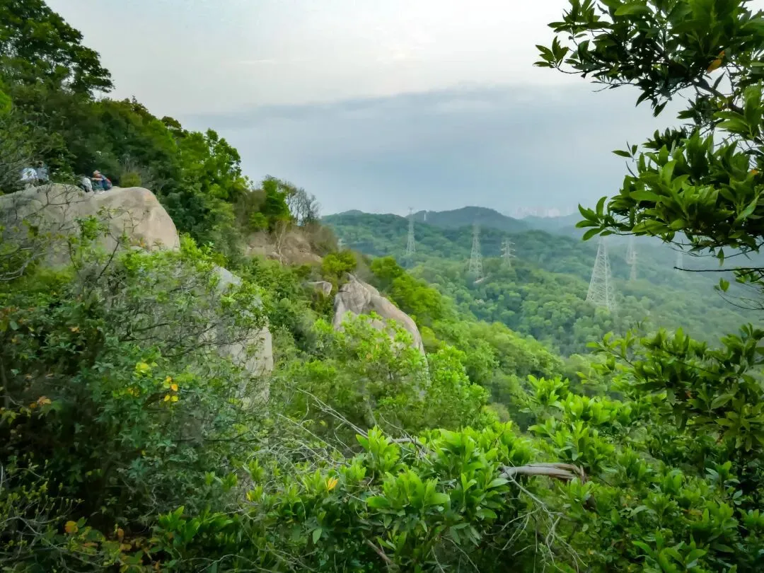 稍作停留,继续向北前往飞云顶。山路岔口虽多,但指示清晰,按路牌行走即可。途中,一处突出的巨石成为绝佳观景台。站在巨石上,眼前景象层次分明:近处,青山翠浪,层叠起伏;中景,凤岩古庙的建筑群点缀在半山腰;远景,福永、沙井的城市轮廓在薄雾中铺开,构成一幅“自然与城市的对话”画卷。