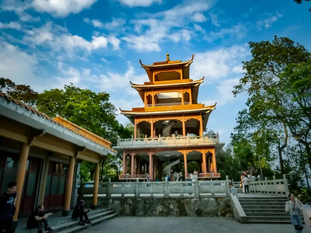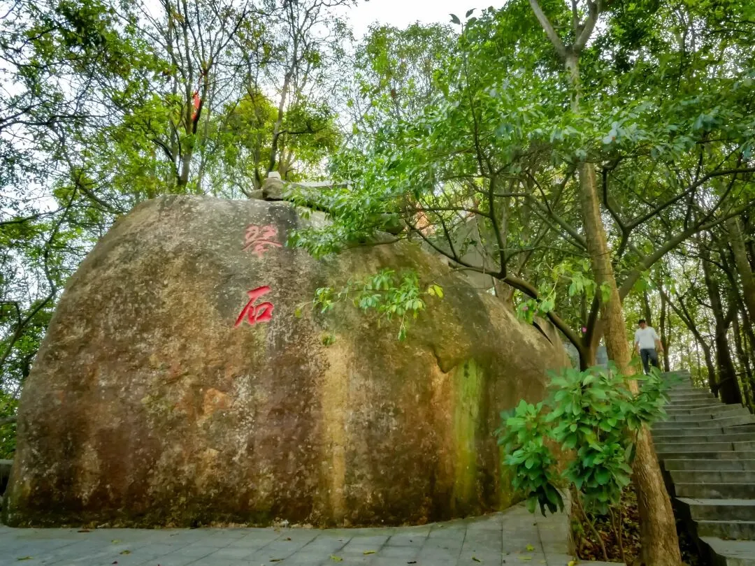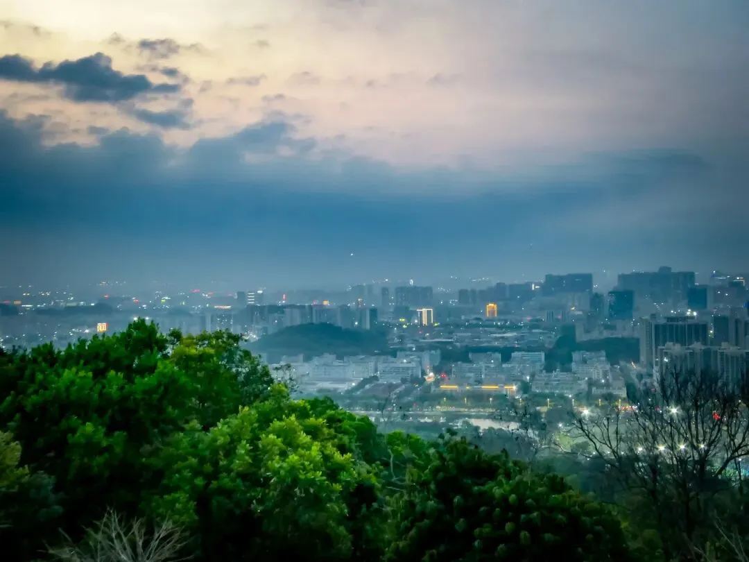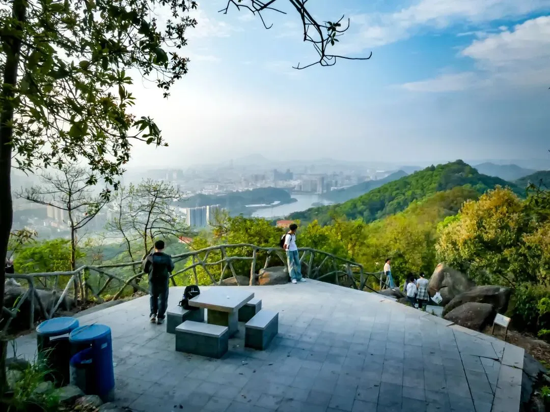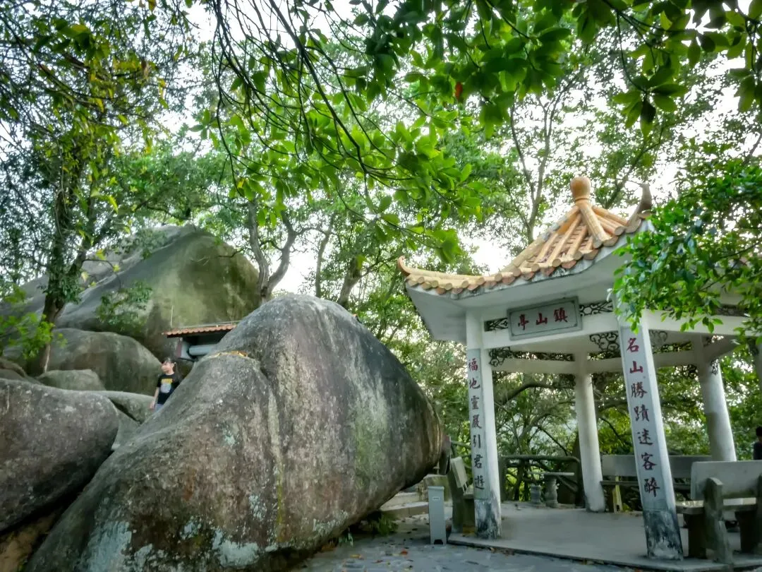 稍作停留,继续向北前往飞云顶。山路岔口虽多,但指示清晰,按路牌行走即可。途中,一处突出的巨石成为绝佳观景台。站在巨石上,眼前景象层次分明:近处,青山翠浪,层叠起伏;中景,凤岩古庙的建筑群点缀在半山腰;远景,福永、沙井的城市轮廓在薄雾中铺开,构成一幅“自然与城市的对话”画卷。