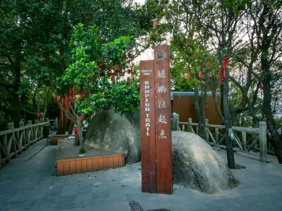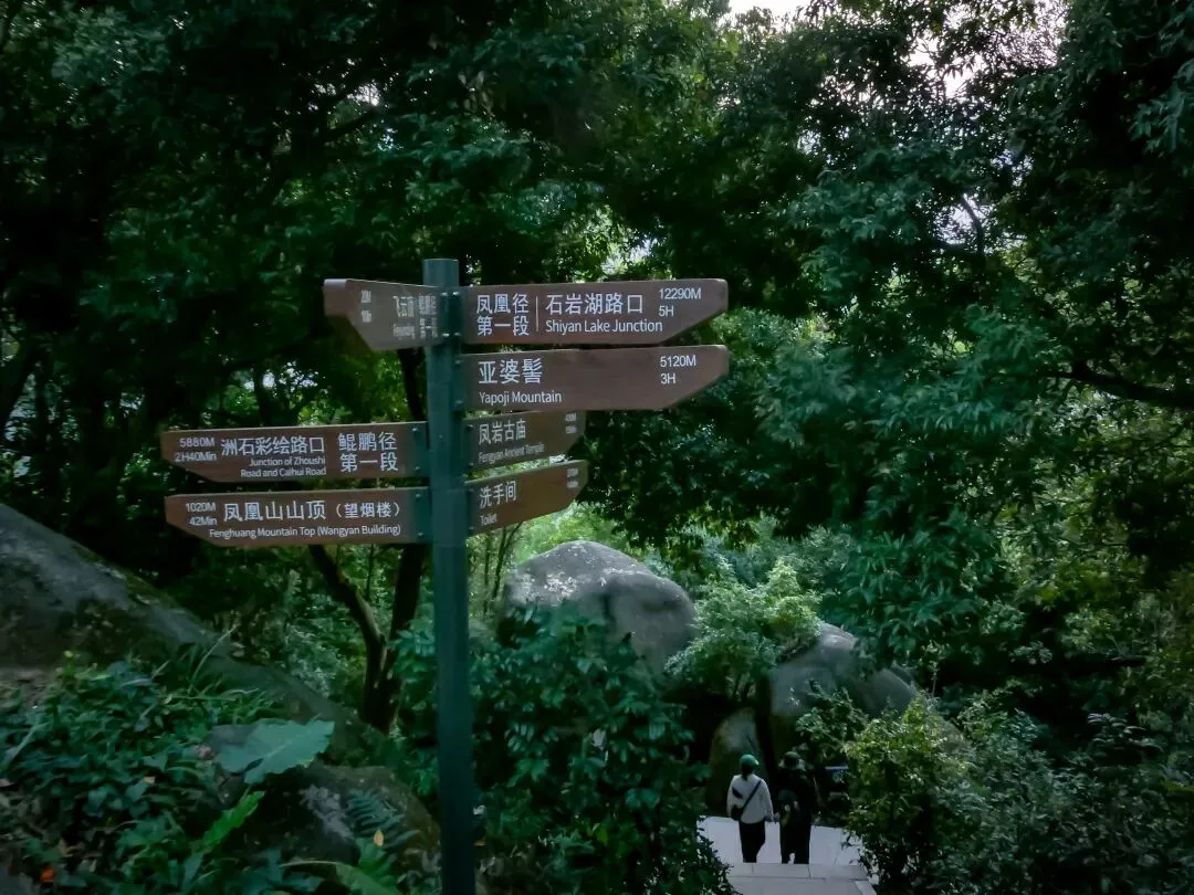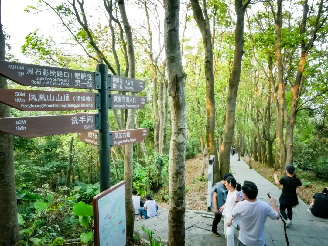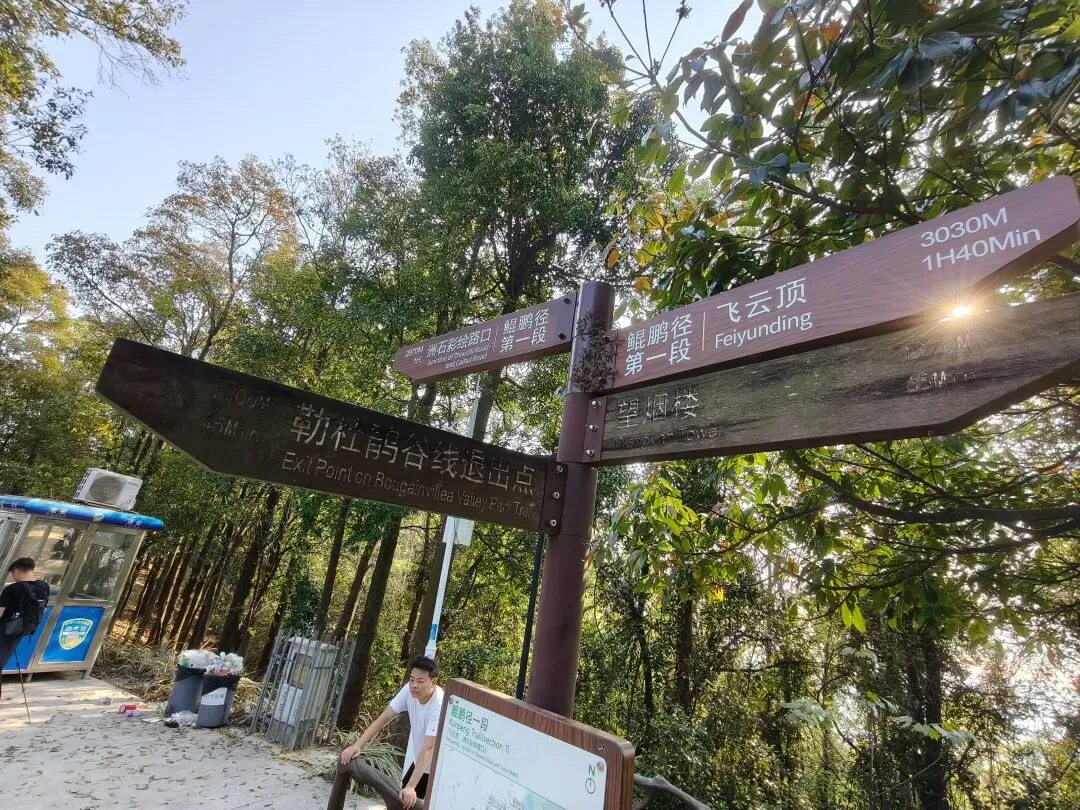 接近飞云顶时,一片巨石群呈现眼前。这里有造型奇特的峋嵙怪石、惊险的悬崖和狭窄的一线天景观,是凤凰山地质奇观的集中体现。最后,抵达飞云顶。这里是鲲鹏径与凤凰径的起点,视野同样开阔,可眺望另一面的城市风光。