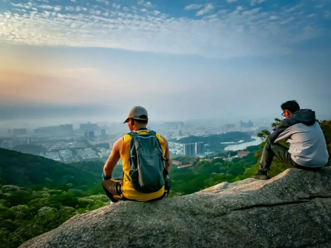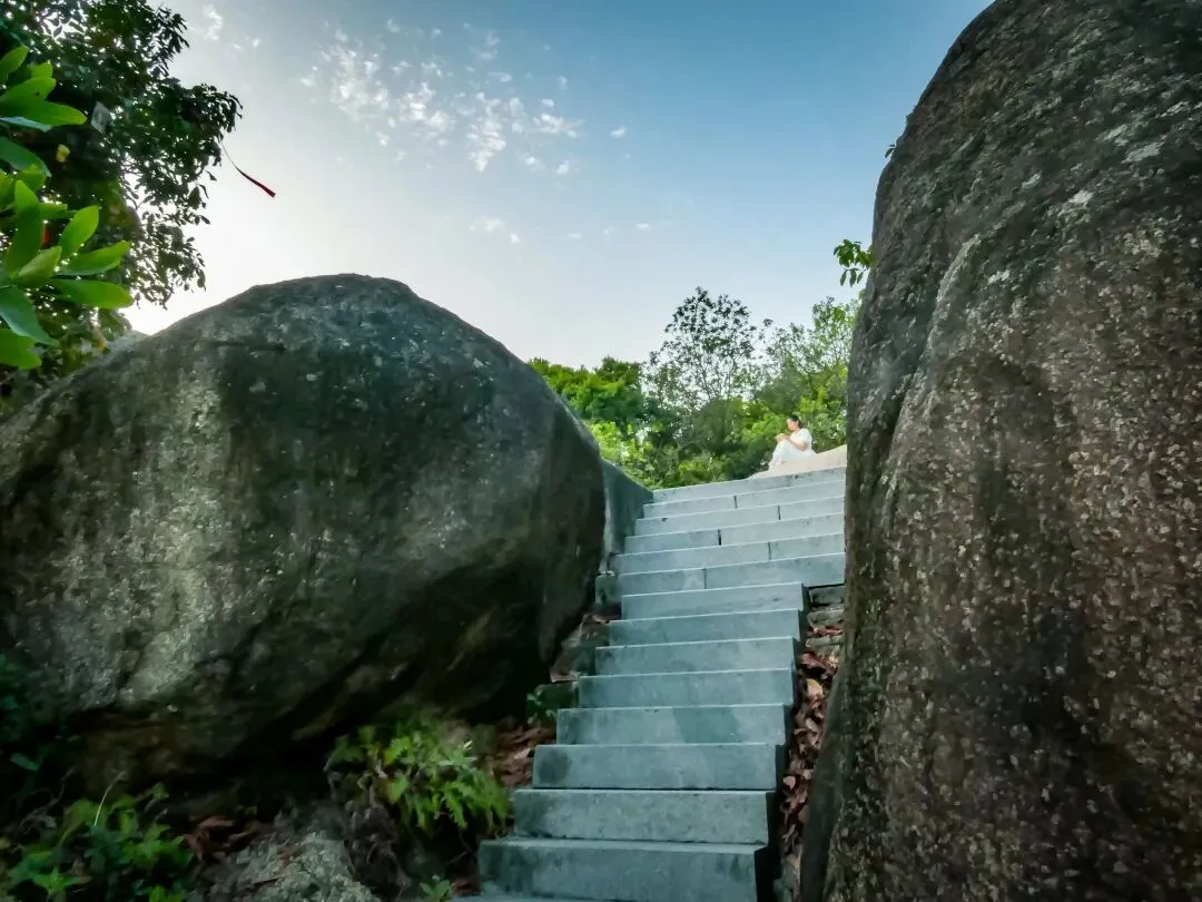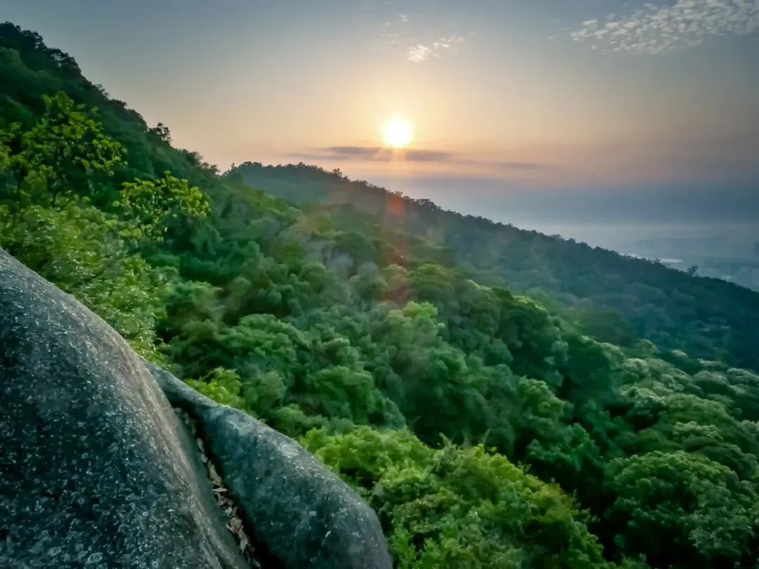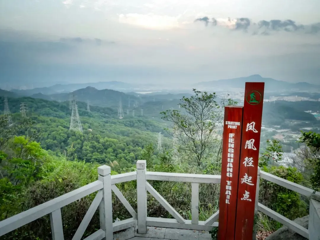 接近飞云顶时,一片巨石群呈现眼前。这里有造型奇特的峋嵙怪石、惊险的悬崖和狭窄的一线天景观,是凤凰山地质奇观的集中体现。最后,抵达飞云顶。这里是鲲鹏径与凤凰径的起点,视野同样开阔,可眺望另一面的城市风光。