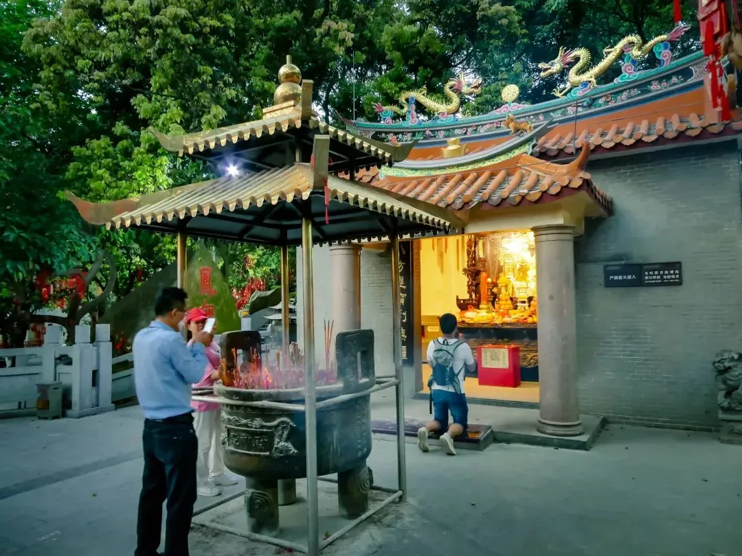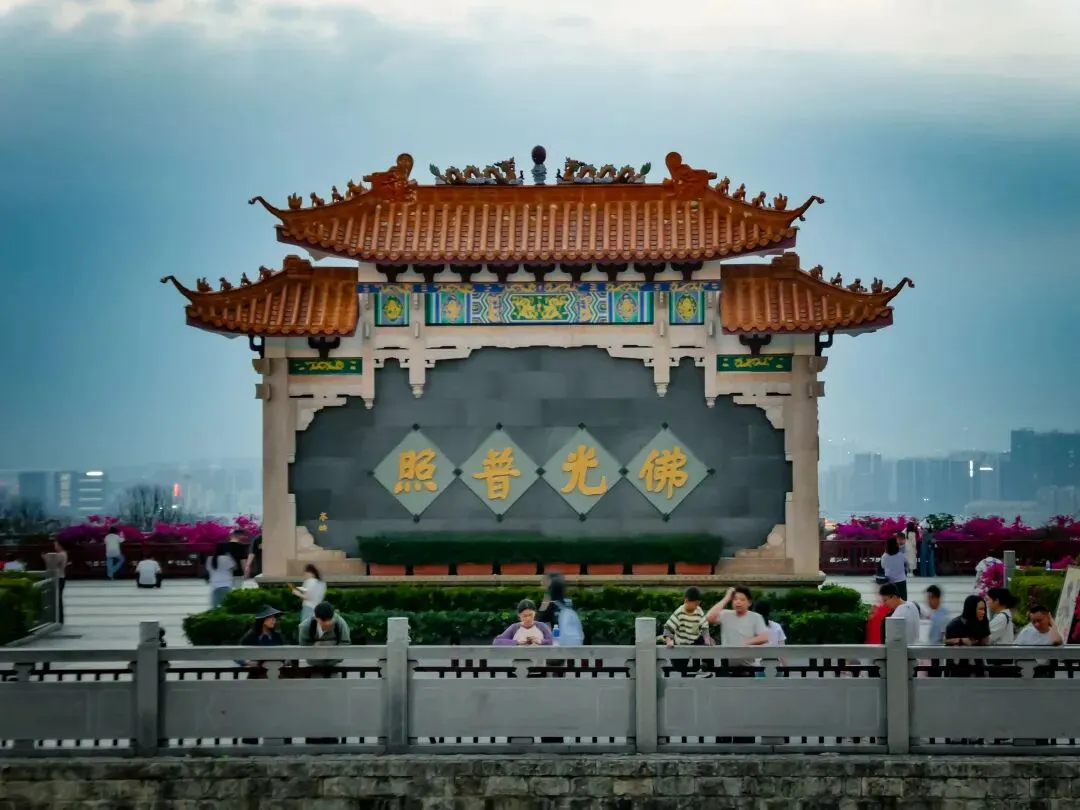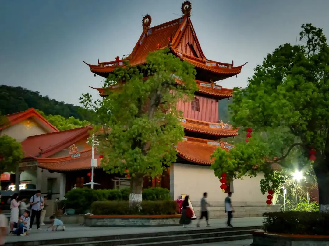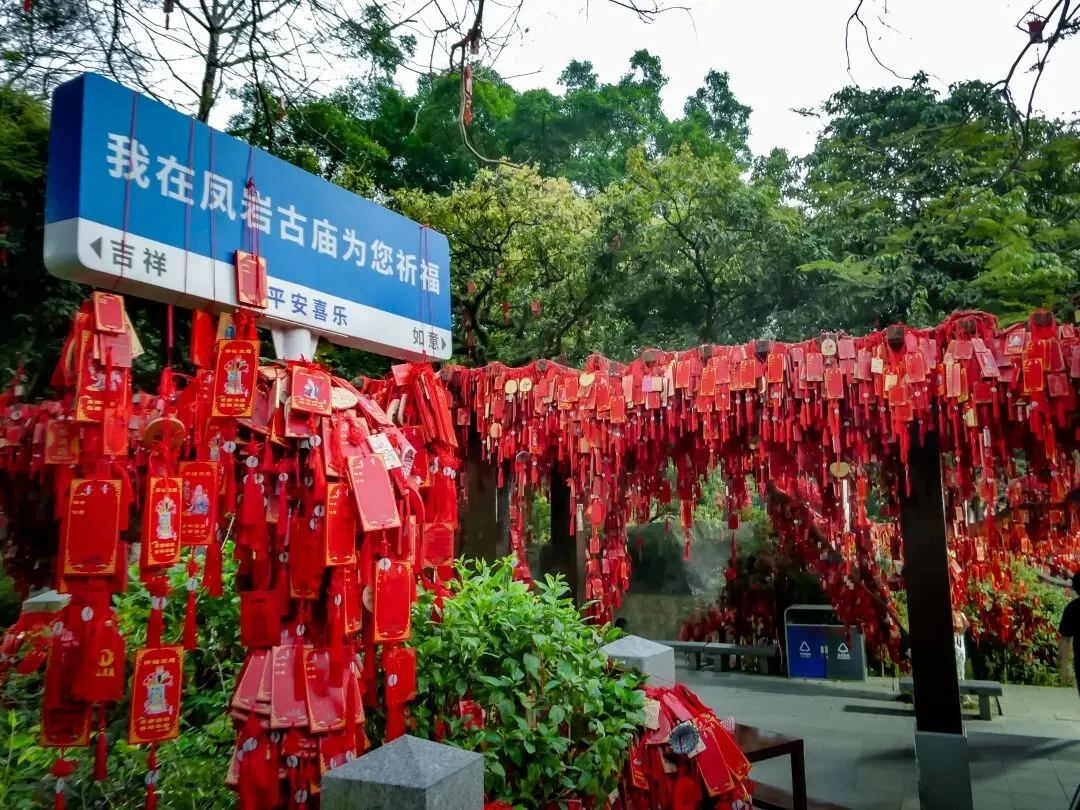 从飞云顶下行,天色渐暗。抵达凤岩古庙时,许愿长廊已亮起暖黄的灯光,长廊里挂满了承载着心愿的木牌,旁边的财神庙烟雾缭绕,香火鼎盛。古庙广场上仍有不少游人驻足,欣赏山间渐渐亮起的万家灯火。