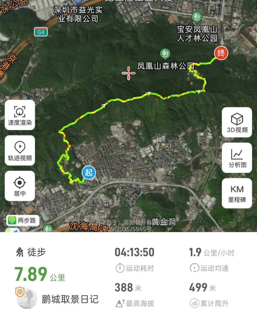 最终回到山脚下,运动手表定格:全程7.89公里,累计耗时4小时13分。