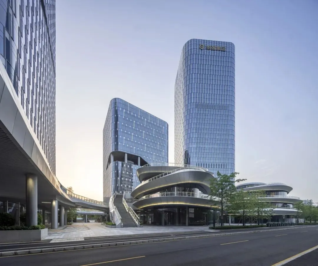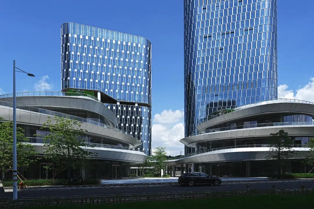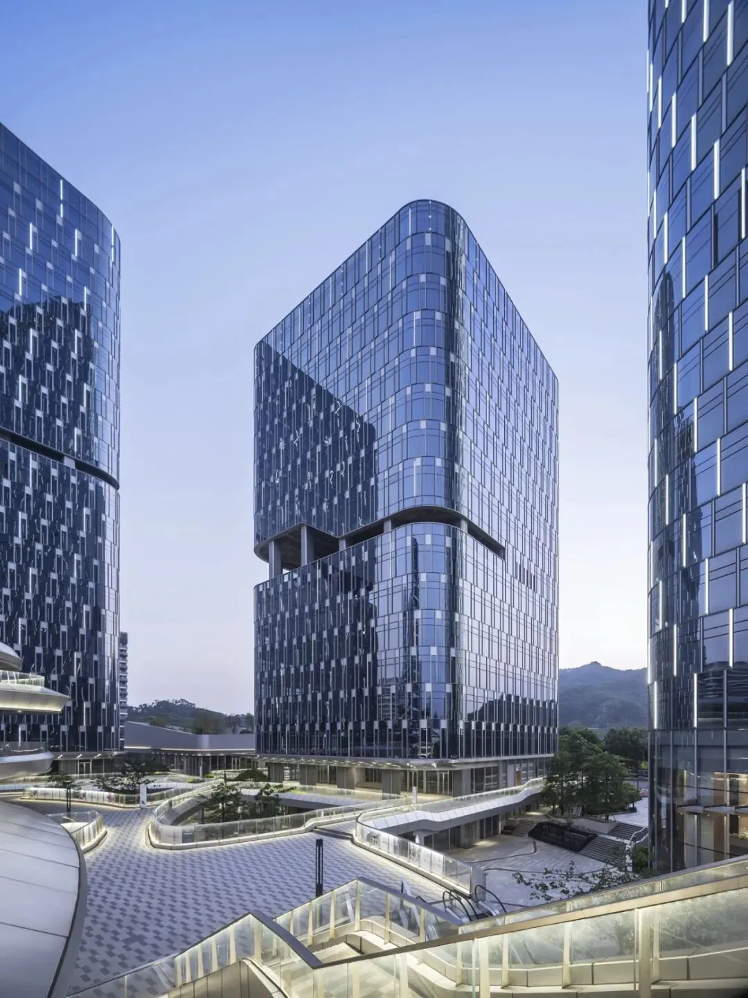 三栋塔楼并非简单并列,而是以“错落 + 旋转”的布局策略,在疏密之间留出通透的视线通廊。横向绿化通廊串联起水平维度的景观渗透,纵向视野则突破建筑界限直抵山巅,让山景成为园区最动人的“背景墙”,实现人工建造与自然肌理的无缝衔接。