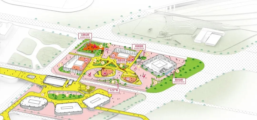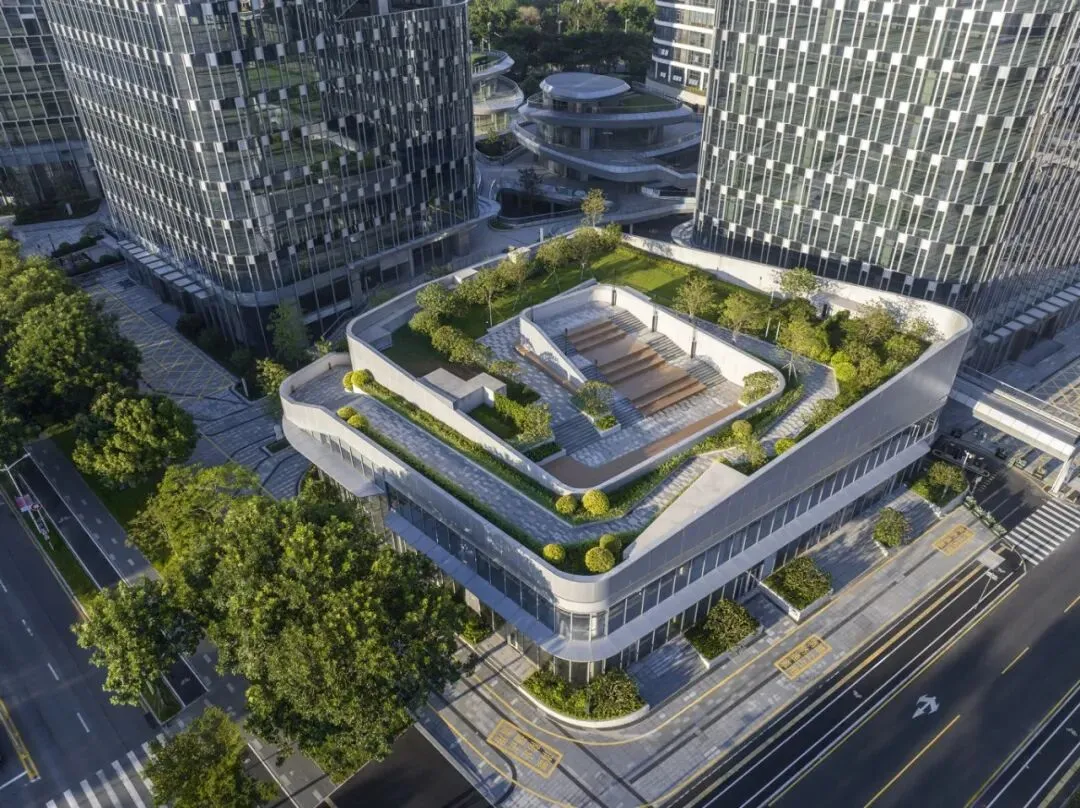 地面层,入口广场、台阶、口袋公园与共享休闲阶相互串联,将研发厂房与城市开放公共空间融为一体,让产业园区不再是封闭的孤岛,而是融入城市生活的活力节点。