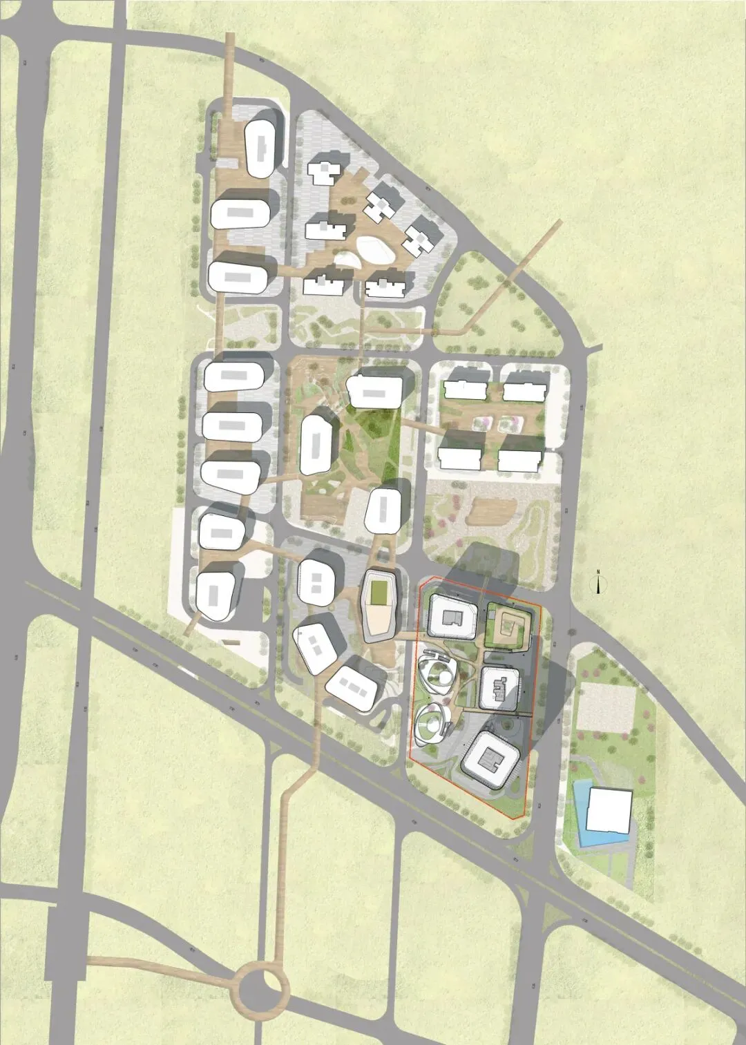 设计的起点,是对场地原生条件的回应,即在空间上保留对山体的实现通廊,又在地面建立立体复核的休闲层台,成为山脚下的歇息驿站。基地东南角崛起150米地标塔楼,以挺拔姿态最大化享有山景视野;辅以100米与70米塔楼,形成“两边高中间低”的错落格局,如同山体轮廓的自然延续。这种与山势呼应的规划,不仅优化了区域天际线的韵律感,更让建筑与山体深度耦合,让每一处空间都能浸润在自然的底色中。