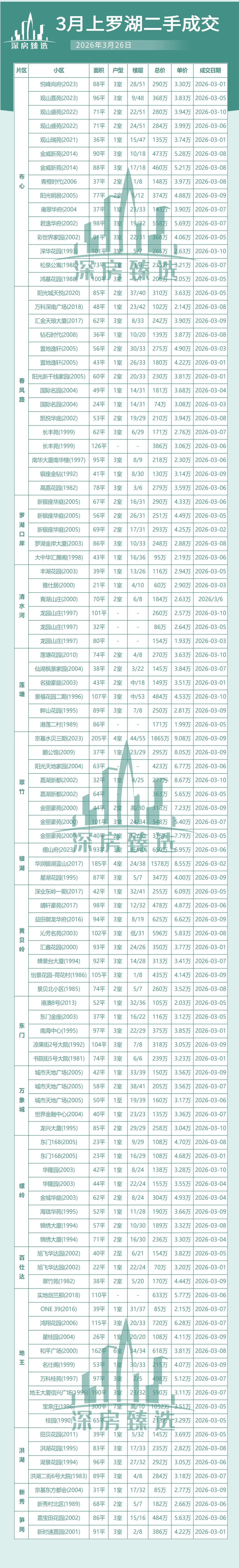 总价300万以下的房源成交占比增多,主要集中在罗湖、坪山中心区、龙岗布吉、龙华观澜、福田八卦岭等区域。