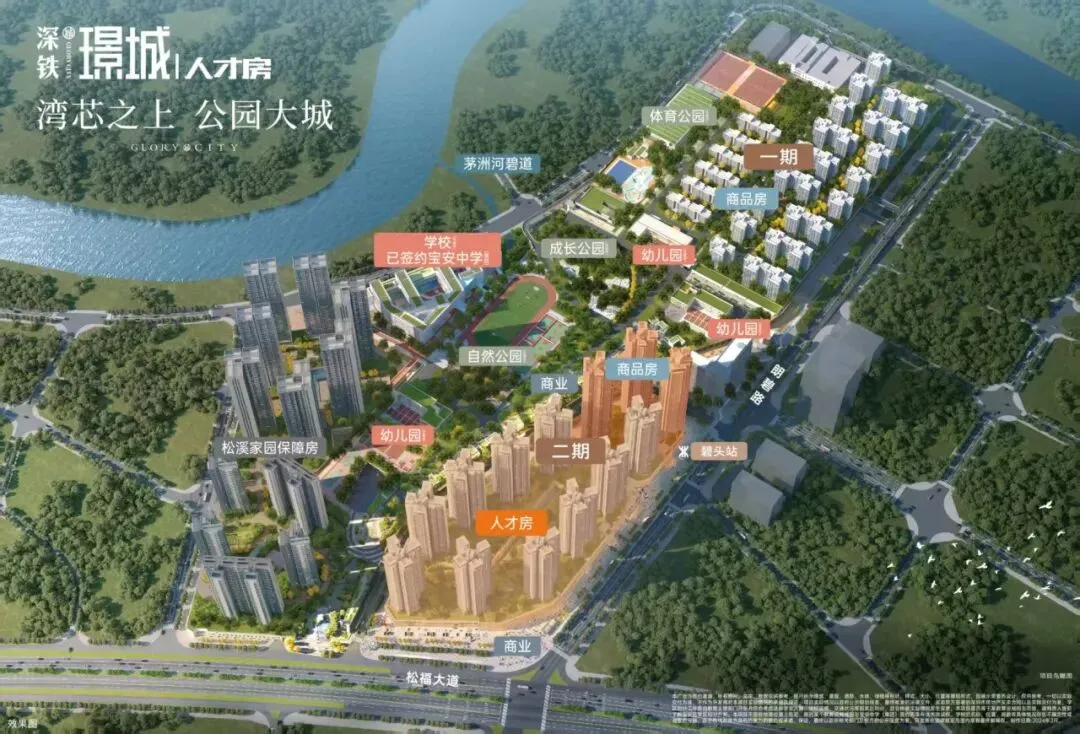 深铁璟城位于宝安松岗,地铁11号线碧头站上盖,总建面约70万㎡TOD大城。社区配建约10万㎡三大公园,紧邻宝安中学(集团)第二实验学校(已开学)。主推建面约 77-151㎡商品房,低密舒居,实景现房;约70-90㎡精装人才房,户型通透,采光视野俱佳,国企品质,精装交付,深圳人才安家西部的理想之选。