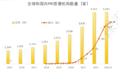 截至2023年9月,联合国负责任投资原则组织(UN-PRI)的全球签署机构达5,331家,资产规模达121.3万亿美元;国内PRI签署机构在2018年以来数量激增,截止2023年9月,我国已有138家机构签署了PRI原则,占比2.6%。截至2023年6月,沪、深、北三市A股上市公司共计5,212家,共有1,714家A股上市公司发布2022年度ESG报告,较上年度增长285家,发布报告的公司数量占全部A股上市公司数量的32.9%,较上年增长3.3%。(1)咨询机构:可作为入行敲门砖,接触业务广,有 ESG + 专业咨询等发展方向。(2)金融机构:银行、券商将ESG纳入投资决策,涵盖财富管理、投行业务等。(3)评级机构:负责制定标准和给企业打分,岗位多样且缺人。(4)企业内部:国央企等各类企业需进行ESG报告披露,设立相关部门及岗位,人才需求大。
