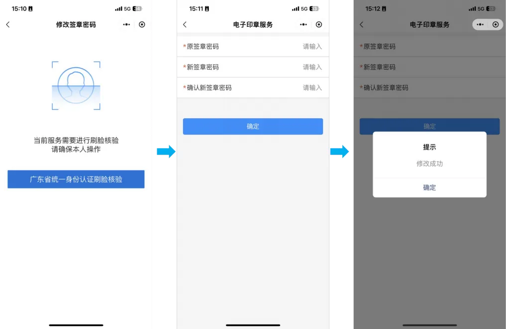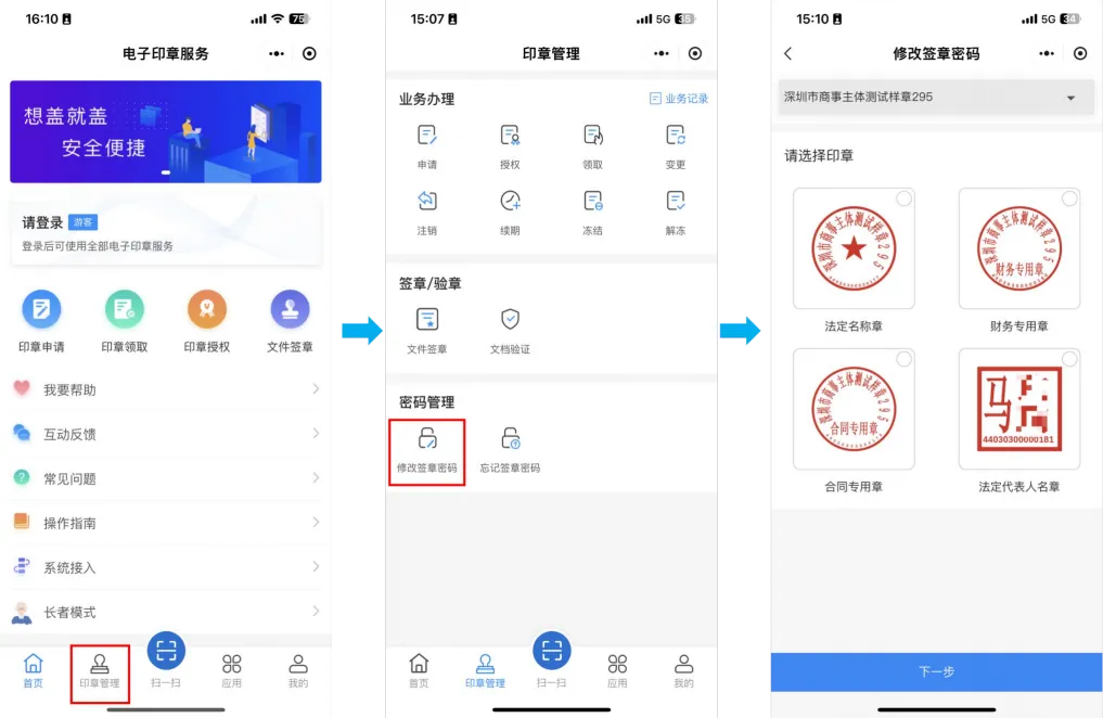 在“深圳市电子印章 ”微信小程序首页点击【印章管理】,选择【修改签章密码】,选择需要修改密码的印章,按照系统提示完成人脸核验,输入该枚印章当前的签章密码,接着输入新密码并再次确认,当系统显示“修改成功 ”的提示时,表示密码已成功更新。