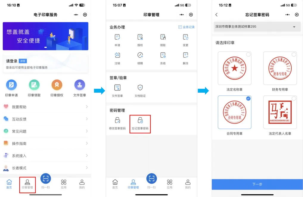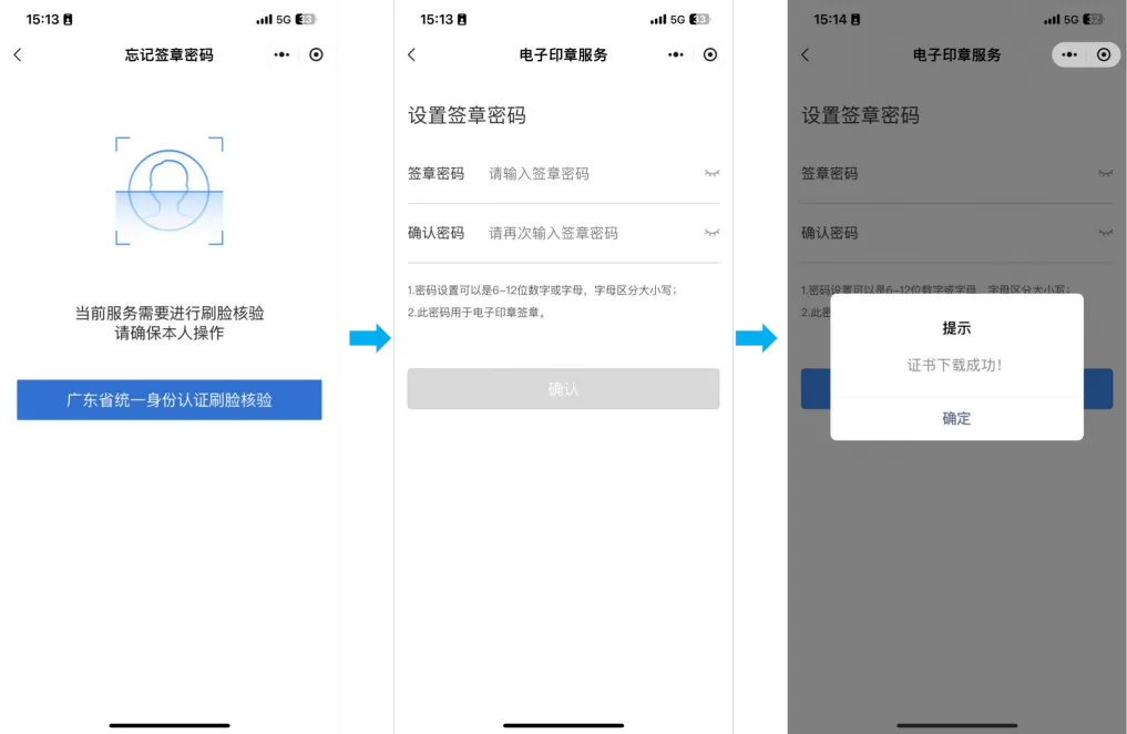 在“深圳市电子印章 ”微信小程序首页点击【印章管理】,选择【忘记签章密码】,选择忘记密码的印章,按照系统提示完成人脸核验,重新设置签章密码,当系统显示“证书下载成功! ”的提示时,表示密码已重置成功。