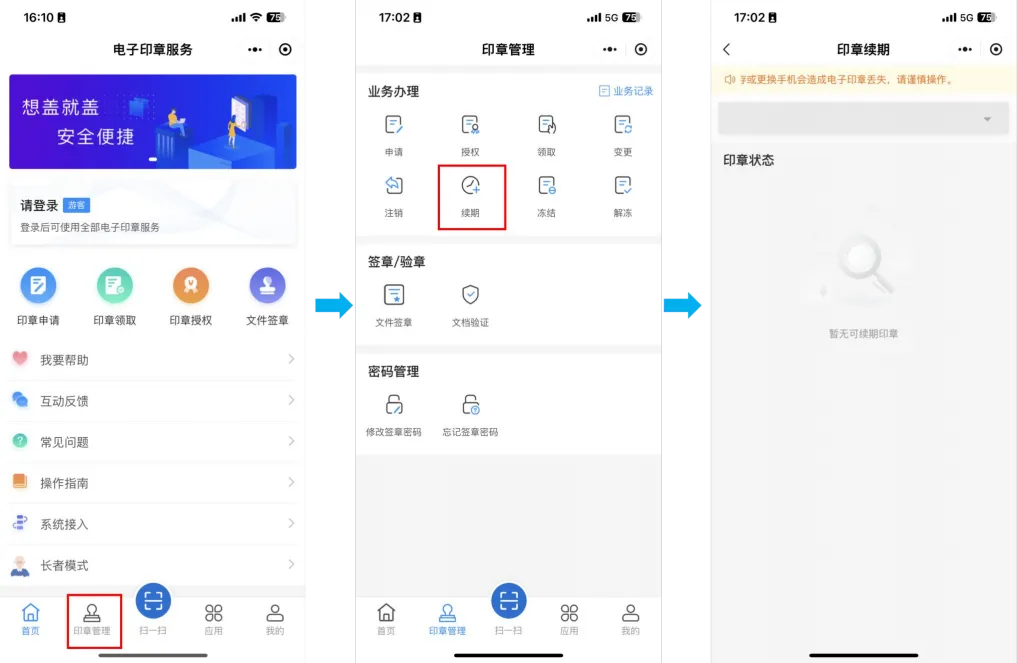 在“深圳市电子印章 ”微信小程序首页点击【印章管理】,选择【续期】,按照系统指引对待续期状态的印章进行续期。