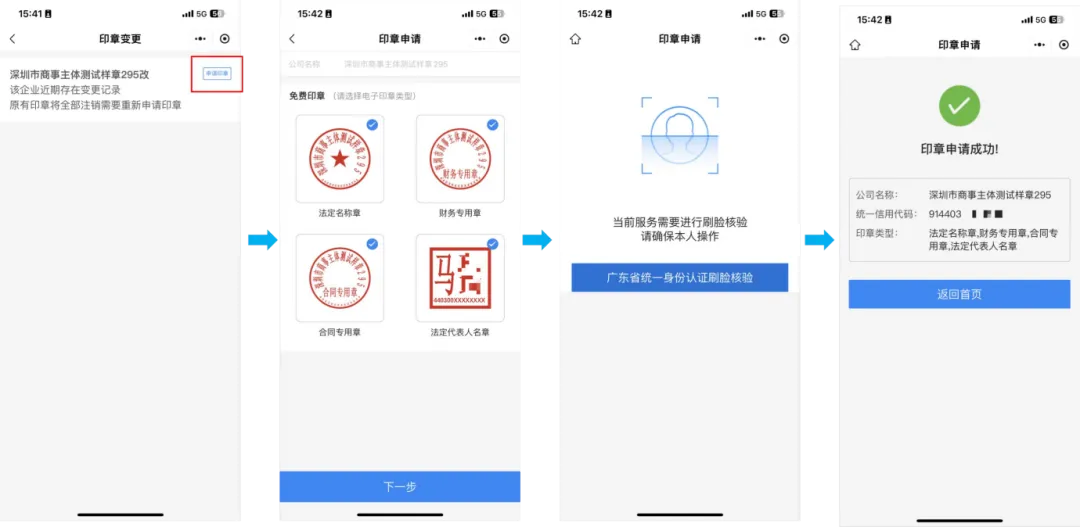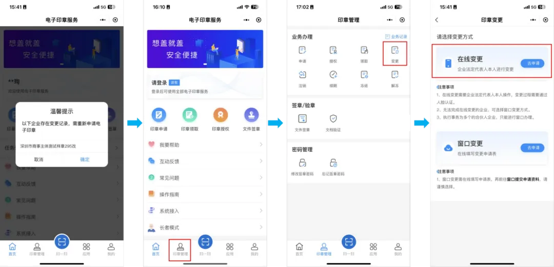在“深圳市电子印章 ”微信小程序首页点击【印章管理】,点击【变更】,在页面中选择【在线变更】重新申请印章,按照系统提示完成人脸核验,核验通过后申请成功。