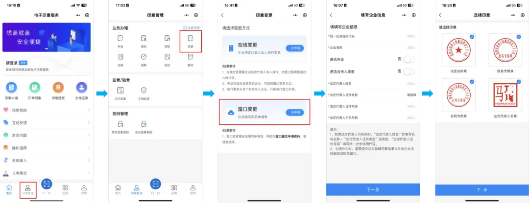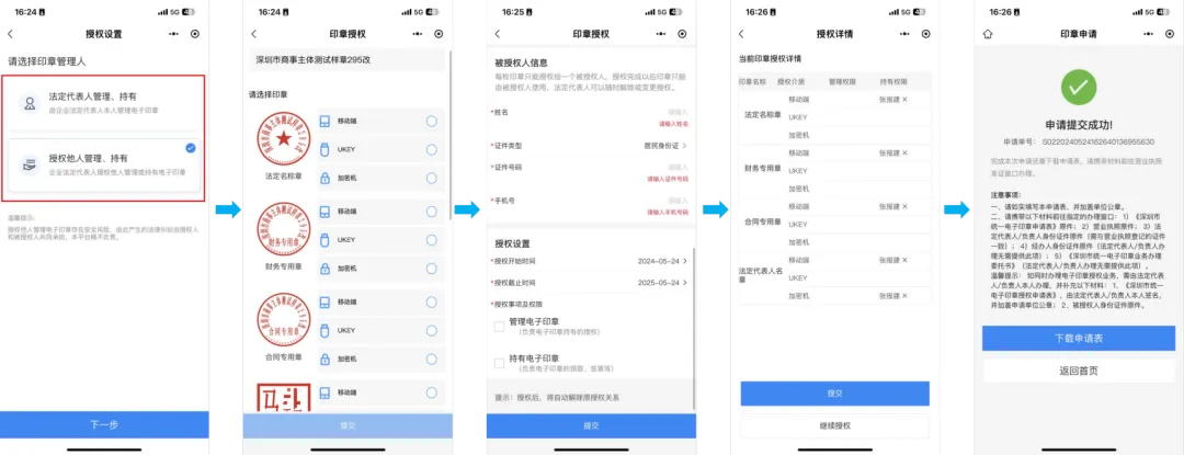 在“深圳市电子印章 ”微信小程序首页点击【印章管理】,点击【变更】,在页面中选择【窗口变更】,准确填写企业信息,选择需要重新申请的印章,可同时进行印章授权设置。如需授权他人管理印章,请根据系统提示选择需要授权的印章和领取介质,同时确保填写被授权人的信息准确无误。完成授权设置后,核对授权信息并提交申请。申请成功后,请下载申请表由法定代表人/负责人签字并加盖单位公章后,携带相关材料前往办事窗口办理。