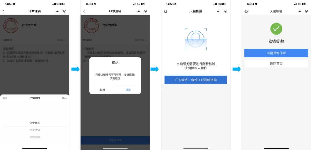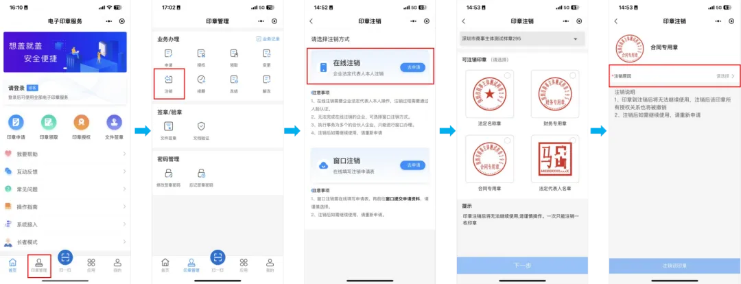 在“深圳市电子印章 ”微信小程序首页点击【印章管理】,点击【注销】,在页面中选择【在线注销】,选择需注销的印章并说明注销原因,随后按系统提示完成人脸核验,核验通过后系统即完成印章注销。