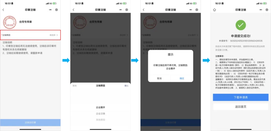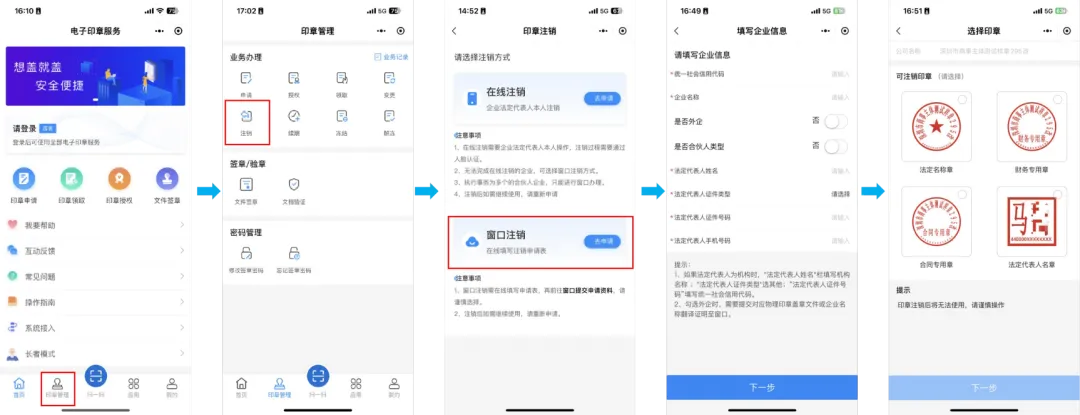 在“深圳市电子印章 ”微信小程序首页点击【印章管理】,点击【注销】,在页面中选择【窗口注销】,准确填写企业信息,选择需要注销的印章,并说明注销原因。确认注销信息后申请提交成功,请下载申请表由法定代表人/负责人签字并加盖单位公章后,携带相关材料前往办事窗口办理。