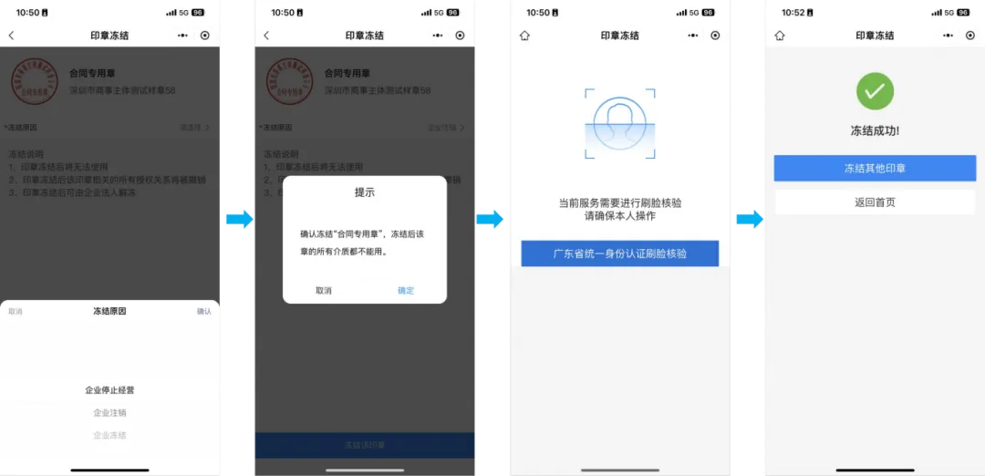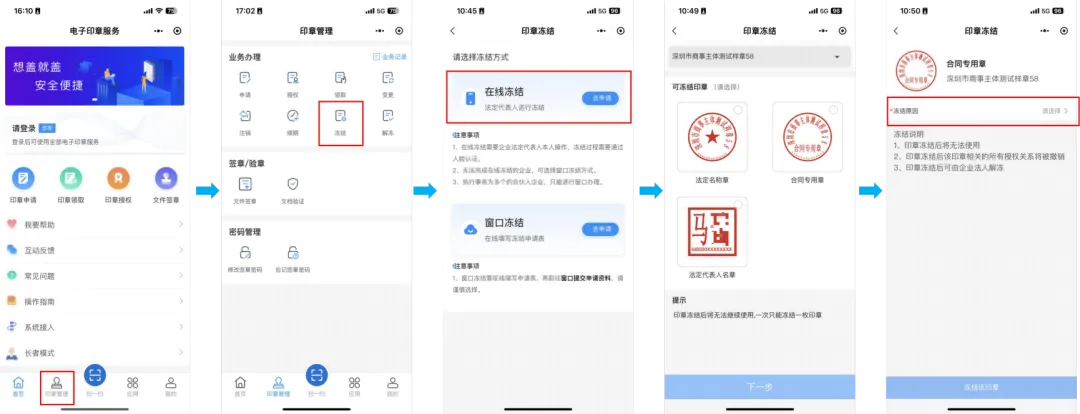 在“深圳市电子印章 ”微信小程序首页点击【印章管理】,点击【冻结】,在页面中选择【在线冻结】,选择需要冻结的印章,并说明冻结原因。接下来,进行人脸核验以确保操作安全,验证通过即完成印章冻结。