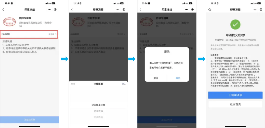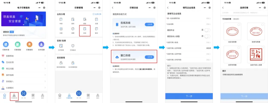 在“深圳市电子印章 ”微信小程序首页点击【印章管理】,点击【冻结】,在页面中选择【窗口冻结】,准确填写企业信息,选择需要冻结的印章,并注明冻结原因。确认冻结信息后申请提交成功,请下载申请表由法定代表人/负责人签字并加盖单位公章后,携带相关材料前往办事窗口办理。