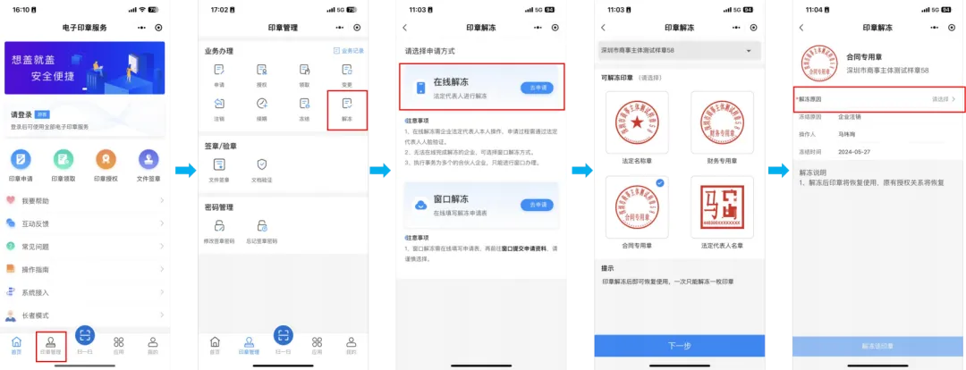 在“深圳市电子印章 ”微信小程序首页点击【印章管理】,点击【解冻】,在页面中选择【在线解冻】,选择需要解冻的印章,并注明解冻原因。接下来,进行人脸核验以确保操作安全,一旦验证通过即完成印章解冻。