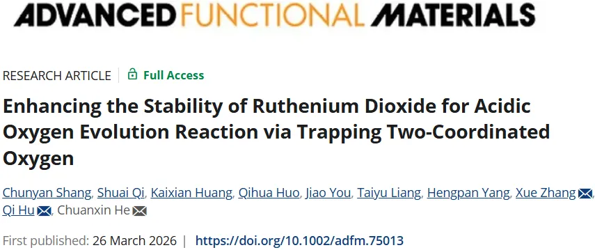 2026年03月26日,深圳大学何传新、胡琪、张雪团队在Advanced Functional Materials期刊发表题为“Enhancing the Stability of Ruthenium Dioxide for Acidic Oxygen Evolution Reaction via Trapping Two-Coordinated Oxygen”的研究论文,团队成员商春彦、亓帅为论文共同第一作者,何传新、胡琪、张雪为论文共同通讯作者。