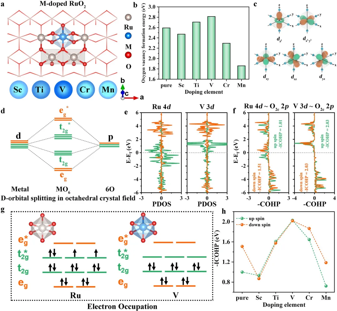 图1 | (a) M-RuO₂(M = Sc, Ti, V, Cr, Mn)的几何结构。(b) M-RuO₂中O₂c的氧空位形成能。(c, d) 八面体晶体场中d轨道分裂示意图。(e) RuO₂和V-RuO₂中Ru和V的PDOS图。(f) RuO₂和V-RuO₂中Ru-O₂c和V-O₂c的-COHP图。(g) RuO₂和V-RuO₂中Ru和V的电子占据示意图。(h) RuO₂中Ru-O₂c以及M-RuO₂中M-O₂c的-ICOHP值。