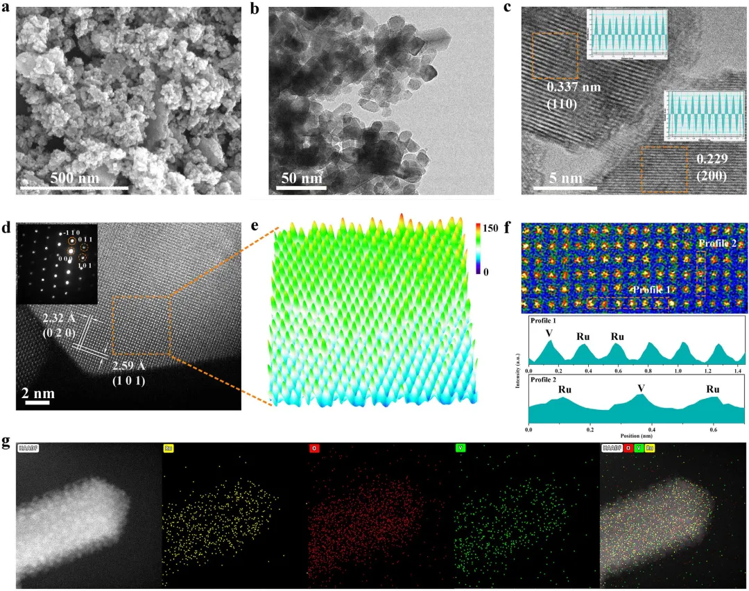 图2 | (a) V-RuO₂的SEM图像和(b)TEM图像。(c) V-RuO₂的高分辨TEM图像。(d) V-RuO₂的HAADF-STEM图像。(e) (d)中选定区域的3D原子重叠高斯函数拟合映射图。(f) (d)中放大区域及对应编号1和2的线扫描轮廓。(g) V-RuO₂的能谱图,显示Ru(黄色)、O(红色)和V(绿色)的均匀分布。