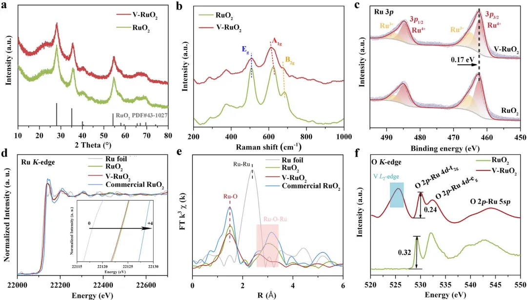 图3 | RuO₂和V-RuO₂的XRD图(a)和拉曼光谱(b)。(c) RuO₂和V-RuO₂的Ru 3p XPS谱图。(d) RuO₂和V-RuO₂在Ru K边的归一化XANES谱图和(e)EXAFS谱图。(f) RuO₂和V-RuO₂的O K边软XAS谱图。
